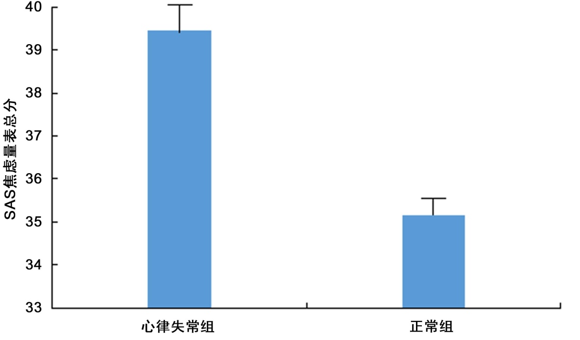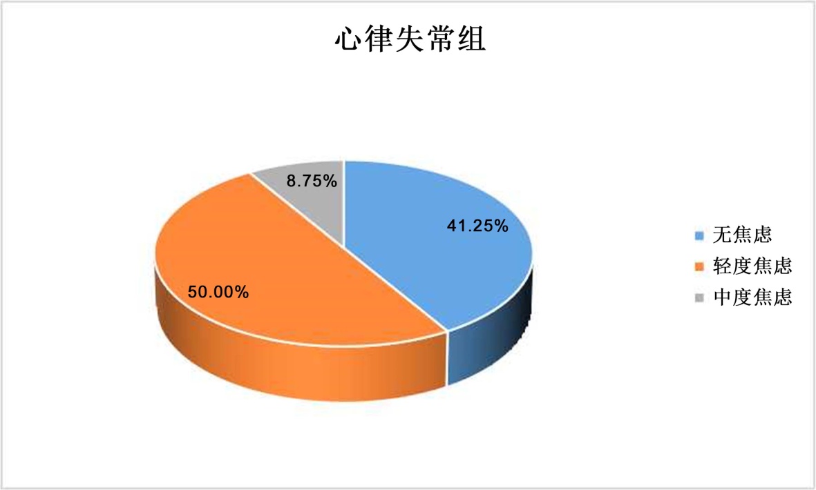 )表示,组间比较采用独立样本t检验,非正态分布者以M (P25, P75)表示,组间比较采用Mann-Whitney U检验。采用Spearman相关分析探究焦虑评分与心律失常的相关性,采用多因素二元Logistic回归分析筛选心律失常的相关影响因素,检验水准α = 0.05,P < 0.05为差异具有统计学意义。