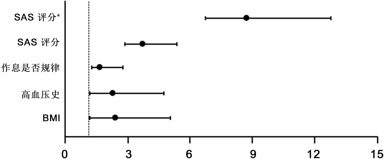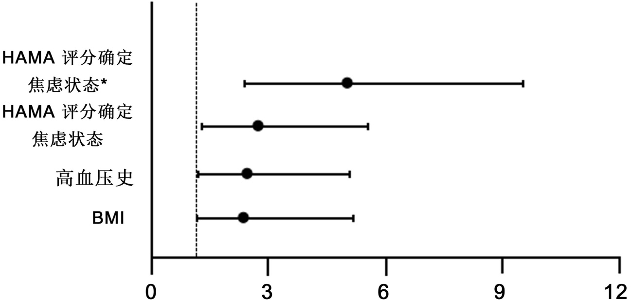 以表7有统计学意义的指标,BMI、高血压史、作息是否规律、每周是否运动、HAMA评分确定焦虑状态作为自变量,以是否发生心律失常为因变量,进行多因素二元Logistic回归分析。结果显示,BMI ≥ 24 kg/m2、有高血压史、HAMA评分确定的焦虑状态是心律失常发生的相关因素(p < 0.05),见表15、图10。