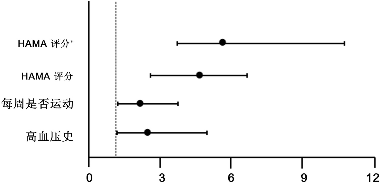 以表8中有统计学意义的指标,BMI、高血压史、作息是否规律、每周是否运动、HAMA评分作为自变量,以是否发生心律失常为因变量,进行多因素二元Logistic回归分析。结果显示,有高血压史、每周不运动、HAMA评分是心律失常发生的相关因素,有统计学意义(p < 0.05)。见表13、图9。