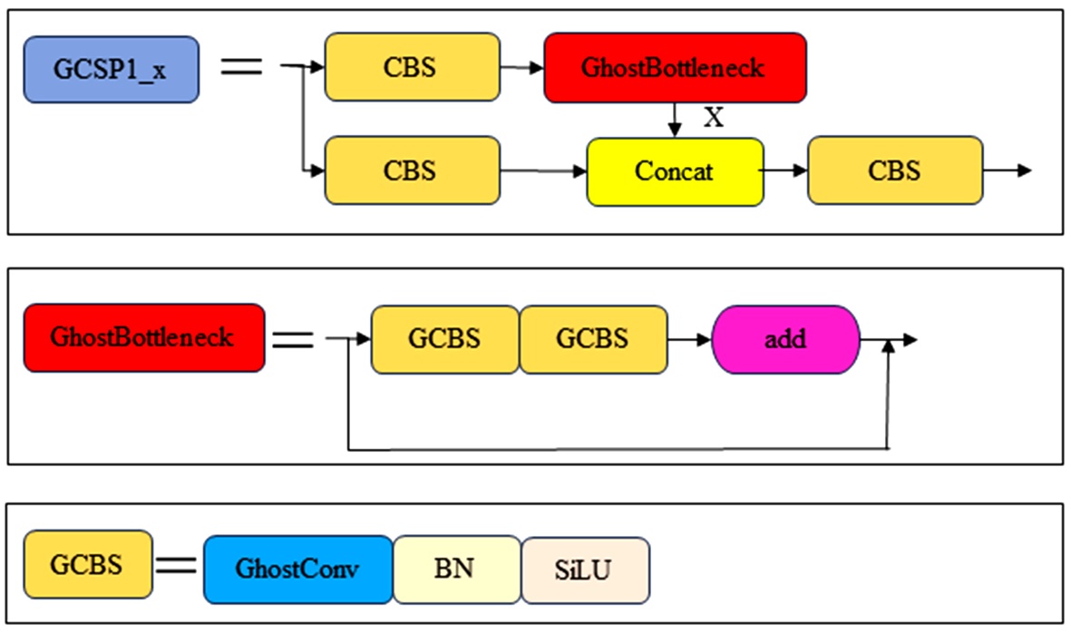 基于上述Ghost模块的轻量化特性,结合本文接触线缺陷实时检测的核心需求,构建轻量化改进结构时,将YOLOv5s_6.0算法Backbone网络中CSP1_x结构的Resunit残差模块替换为GhostBottleneck模块,具体实施方案为将Resunit残差模块中的普通卷积层替换为Ghost模块,以实现网络计算量的缩减与模型轻量化。为便于后续表述,将替换后的卷积层定义为GhostConv,替换后的CSP1_x结构定义为GhostCSP1_x,简称GCSP1_x,如图4所示,为后续算法性能验证与分析奠定基础。