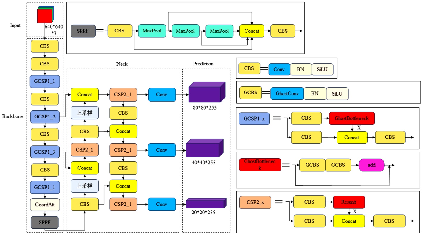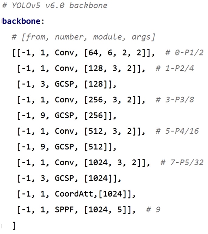 改进后的YOLOv5s_6.0算法的Backbone网络代码如图6所示。其中,Conv代表CBS模块;GCSP代表轻量化后的CSP模块;CoordAtt代表CA注意力模块。