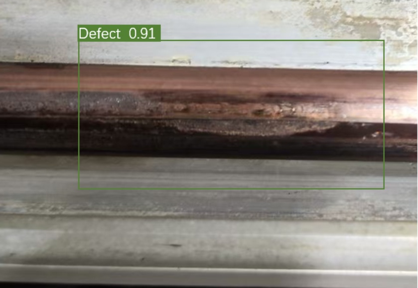 为更直观地验证改进后YOLOv5s_6.0算法的实际缺陷识别效果,本文将图1所示的接触线异常磨耗样本图像输入该算法进行接触线缺陷检测,其缺陷识别示意图如图9所示,其置信度为0.91。