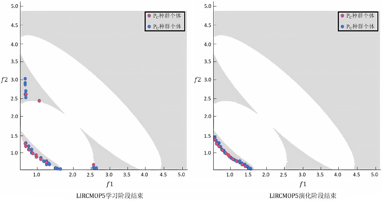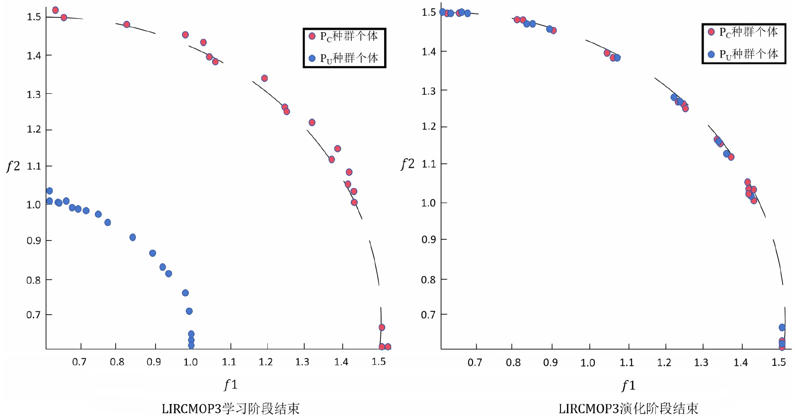 DPSCEA算法在LIRCMOP3测试问题的运行如图4所示,在学习阶段结束后,得到CPF与UPF的重叠比例为0,因此判断为低重叠情况,在演化阶段采取低重叠情况的演化策略来引导种群进化,低重叠场景:两种群搜索空间差异显著,优先利用PC种群优质基因,深度挖掘PC种群的优化潜力,结合多样性状态动态调整搜索方向,且进行局部求精。在演化阶段结束后,对种群混合后进行环境选择,可得到完整的最终帕累托前沿解集。
