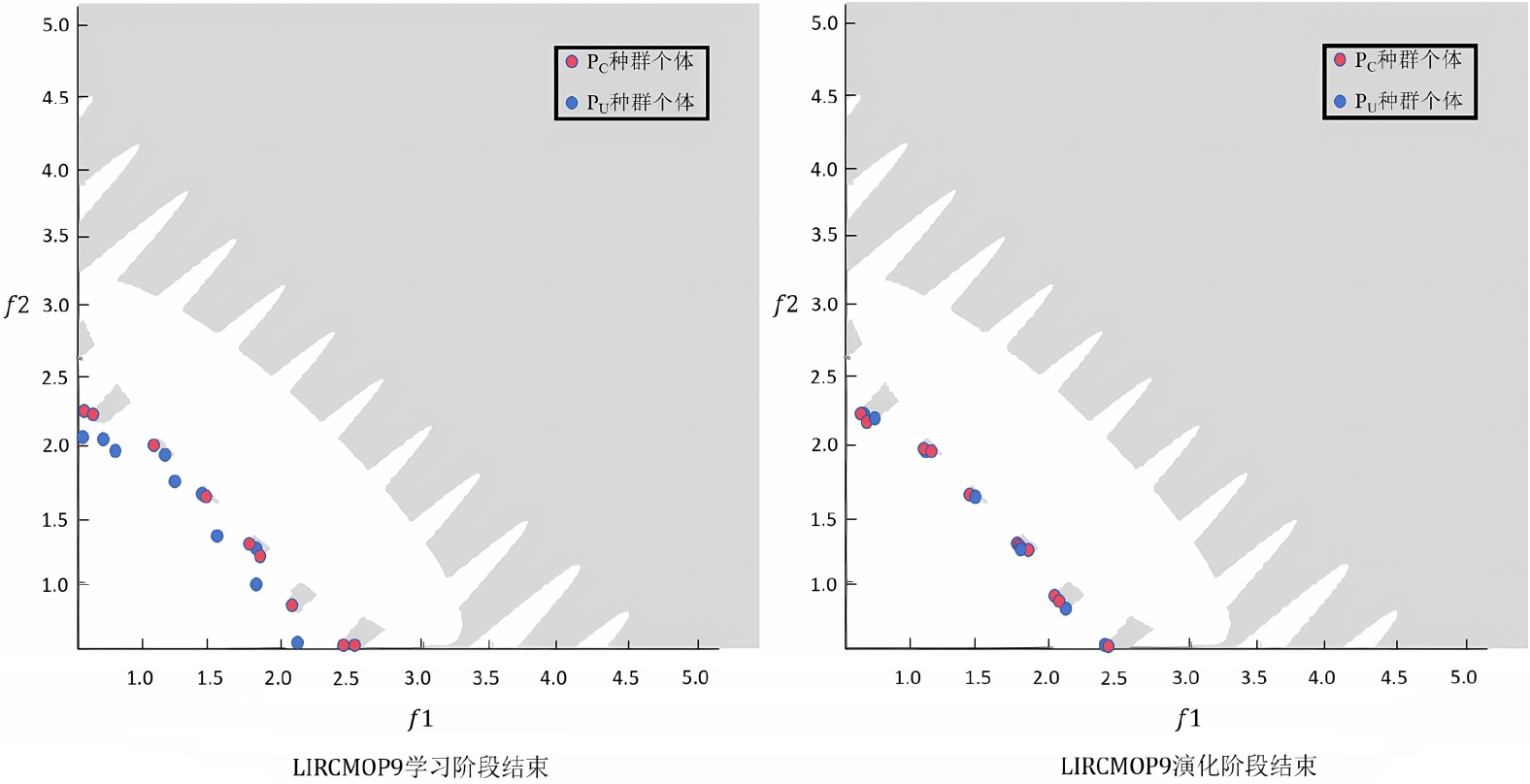 DPSCEA算法在LIRCMOP9测试问题的运行如图3所示,在学习阶段结束后,得到CPF与UPF的重叠比例约为0.5,因此判断为中等重叠情况,在演化阶段采取中等重叠情况的演化策略来引导种群进化。中等重叠场景中兼顾探索广度与利用深度,采用多策略融合模式,同时平衡探索与协同,积极强化PC种群优质基因的迁移利用,同时平衡探索与协同。在演化阶段结束后,对种群混合后进行环境选择,可得到完整的最终帕累托前沿解集。
