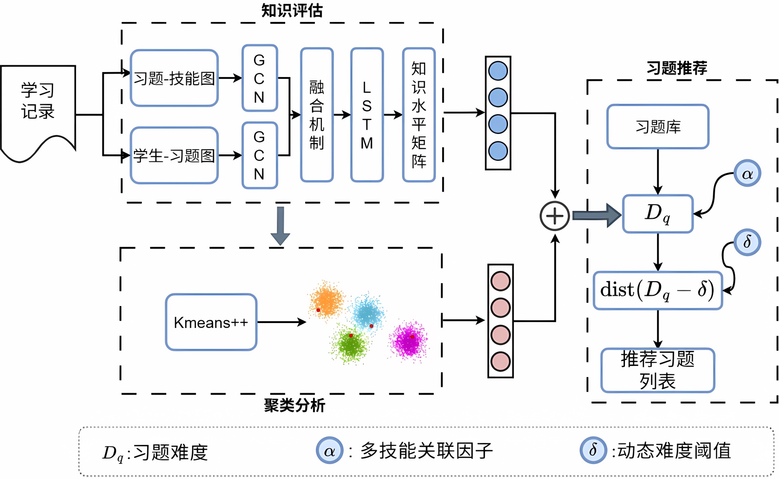 本研究提出的习题推荐方法KSPC-ER,核心目标是解决当前习题推荐方法存在的针对性不强、新颖性与多样性欠缺的问题。该方法整体框架如图2所示,涵盖三大核心模块:知识评估模块、聚类模块、习题推荐模块。其中,知识评估模块通过深度融合学生细粒度答题信息,构建学生–习题图与习题–技能图,运用图卷积网络GCN和LSTM网络获取学生知识状态;聚类模块基于学生个体知识特征实施聚类分析,并挖掘不同学习群体的知识掌握规律、学习偏好及提升需求,为个性化推荐模块提供群体层面的优化依据;习题推荐模块作为最终执行单元,通过构建多技能关联的习题难度评估方法,结合群体聚类结果与学生个体知识状态,引入动态阈值调控机制,最终生成兼具准确性、新颖性与多样性的个性化习题推荐列表。