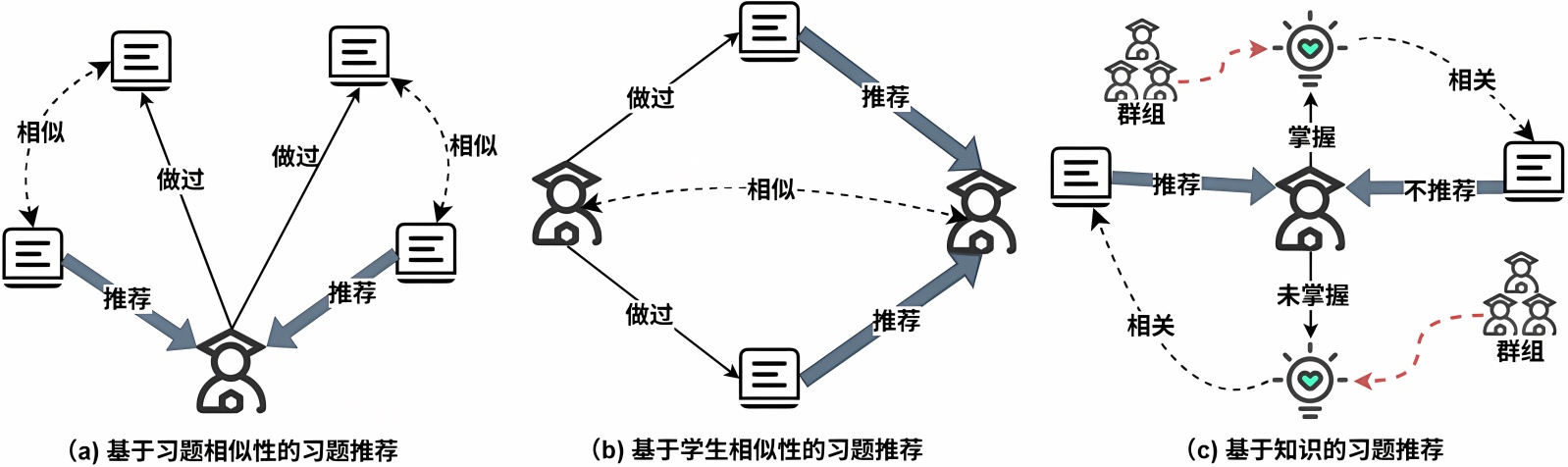 近年来,许多研究致力于习题推荐。传统习题推荐方法以协同过滤为核心范式,分为基于习题相似度与基于学生相似度的推荐方法[2] [3]。其中,基于习题相似度的推荐方法[2] [4],是向目标学生推送与已完成习题具有较高相似性的其它习题(如图1(a)所示);而基于学生相似度的推荐[3]则是将与目标学生特征相似的其他学生所完成的习题,作为推荐内容推送给目标学生(如图1(b)所示)。然而,这类方法未能挖掘学生与习题之间的内在关联,而这种关联正是判断学生学习能力与习题难度匹配的关键因素。此外,传统方法忽略了学生在知识状态的个体差异,无法根据学生自身的知识缺口匹配对应习题,最终导致推荐结果与学生学习需求脱节。