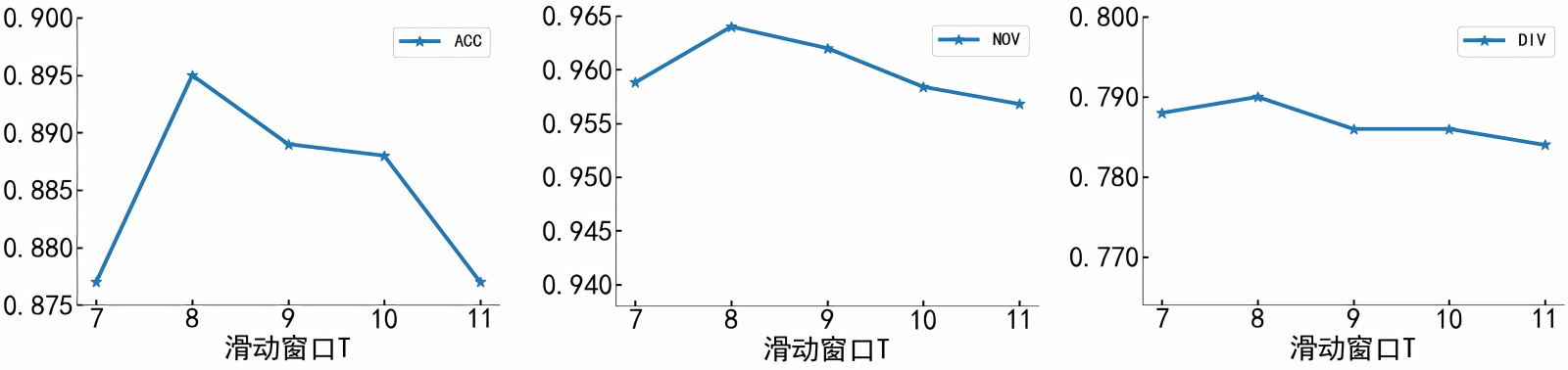时推荐效果最好。T偏小导致近期信息不足,阈值难以反映真实水平;T偏大易引入过时历史数据,降低推荐准确性。