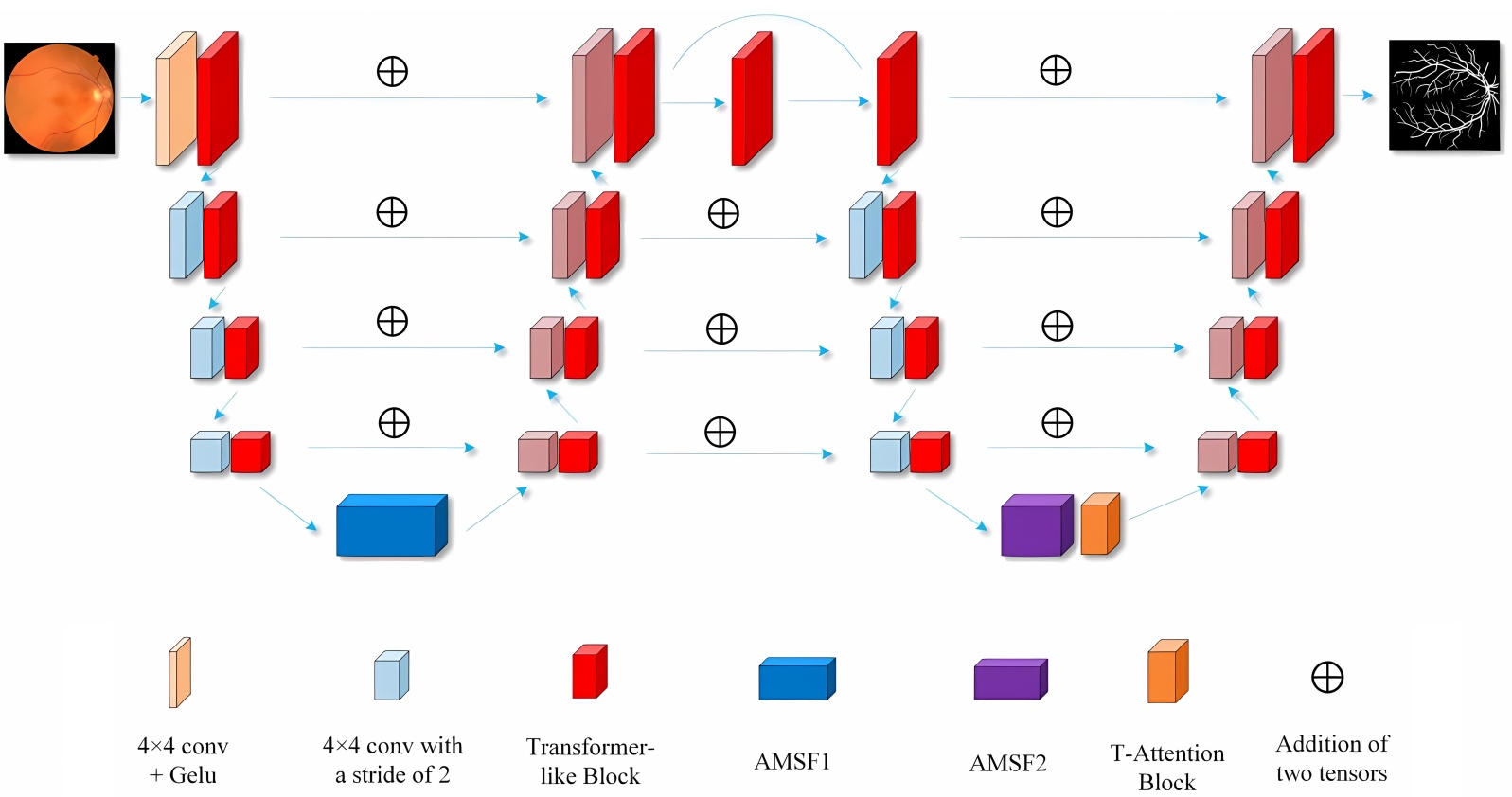 视网膜血管具有极高的尺度动态性,主干血管与毛细血管末梢在图像中的像素表现跨度显著。单一感受野的卷积核难以同时有效捕捉所有尺度的血管。常规的U型网络在瓶颈处通常采用对称或单一尺度的结构,这导致模型在第一阶段容易丢失微小血管特征,而在第二阶段又缺乏对全局背景的有效抑制。虽然多尺度特征融合是常见解决方案,但在网络不同深度(或不同处理阶段),对多尺度信息的需求应有侧重。为此,我们设计了非对称多尺度融合模块,采用非对称策略,分别嵌入在两个阶段的瓶颈处。在第一个阶段,利用小扩张率组合“广泛探测”所有可能的血管候选特征,避免早期丢失微小血管信号;在第二个阶段,在更丰富的上下文和初步分割线索基础上,利用大扩张率与全局路径进行“精准聚焦”和融合,以区分真实血管与噪声,并修正细节。这种设计逻辑确保了模型在不同迭代深度下能够自适应地平衡局部细节与全局语义。两个AMSF模块具有不同的结构,如图3所示。