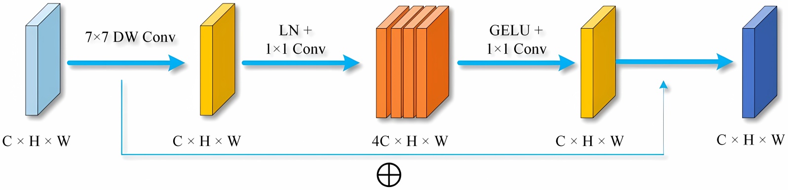 其后,遵循“窄–宽–窄”的设计原则,首先通过层归一化(LayerNorm)稳定分布,随后利用1 × 1卷积将特征通道扩张4倍,经GELU激活函数处理后,再由另一个1 × 1卷积压缩回原始维度。该过程如公式(2)所示: