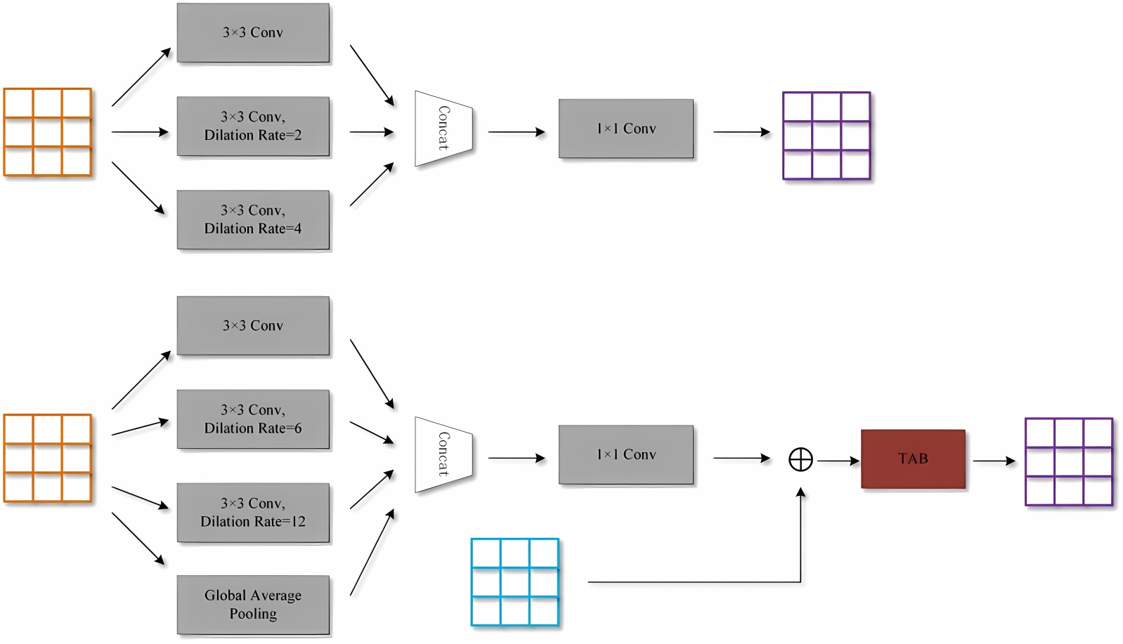 其次,利用AMSF-2 (即第二阶段底部)融合更广阔的上下文和全局信息。它包含三个并行分支,使用更大的扩张率