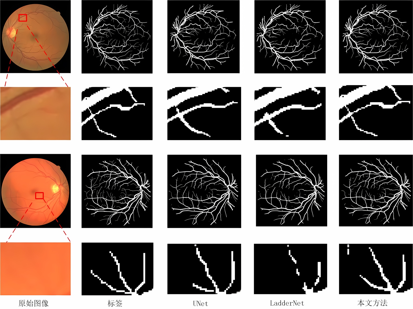 为了进一步直观验证本文方法的分割性能,图5展示了本文方法与U-Net、LadderNet的可视化对比结果及局部放大效果,我们选取了具有不同血管形态与背景复杂度的代表性样本进行展示。观察第一组和第二组局部放大图可以发现,由于视网膜末梢血管与其背景的对比度极低,U-Net和LadderNet在处理纤细分支时均出现了明显的特征丢失与拓扑断裂现象。而本文方法得益于大核卷积残差块LKCRB提供的大尺寸感受野以及AMSF模块的多尺度特征融合,能够精准捕捉到对比度极低的微细血管,并保持了血管树结构的逻辑连通性,分割结果最接近专家标注(标签)。在血管密集分布及靠近视盘的区域,传统算法极易受到背景亮度不均或组织干扰,导致分割边缘模糊。本文方法生成的分割图边缘更加锐利且平滑,这证明了坐标注意力(CA)通过水平与垂直方向的空间编码,实现了对血管位置的精准校准,从而有效抑制了非血管区域的误判噪声。通过对比观察,本文方法在处理血管交叉与分支点处展现出更强的形态学还原能力,避免了LadderNet中常见的像素粘连问题。这种高保真度的分割效果,为后续临床上进行血管直径测量和扭曲度分析提供了可靠的数据支撑。整体而言,可视化结果与前述量化指标相互印证,表明本文方法在提升血管检出敏感性的同时,亦保持了较好的结构一致性与细节还原能力。
