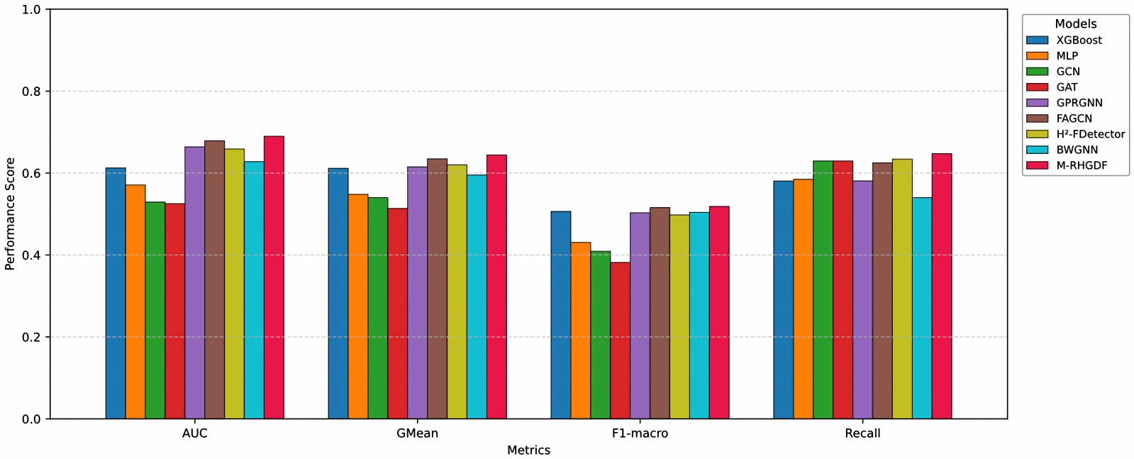 为全面评估所提多关系异构谱图检测框架(M-RHGDF)的有效性,本文在真实的财务报表欺诈检测数据集FDCompCN上进行了广泛的对比实验。基线方法涵盖了传统机器学习模型、通用图神经网络、针对异质图优化的图模型以及专用的异常检测图模型。具体的性能表现如表5和图3所示。