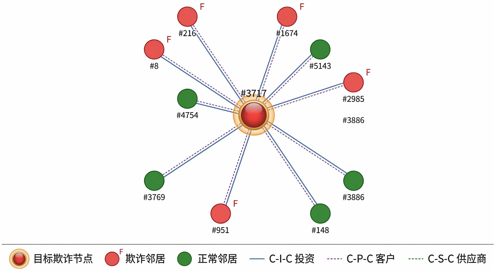 枢纽型伪装节点#3717是一个在企业关联网络中具有显著伪装性的欺诈公司,它通过C-I-C (投资关系)和C-P-C (客户关系)两种关系与10个邻居节点建立了紧密联系。如图4所示,其邻域呈现出典型的“混合伪装”结构——10个直接邻居中有5个为正常公司、5个为欺诈公司。该节点的局部异质性比例为50%,远高于全图平均水平(约10.5%),表明该区域是欺诈行为高度集聚的“灰色地带”。