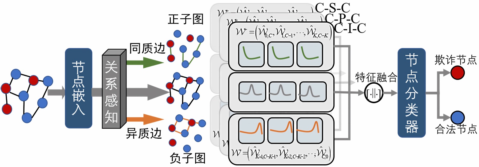 为解决欺诈图中的这种异质性挑战,基于异质性假设的图神经网络方法被提出。解决思路主要有两种:一是通过图结构学习来减少异质连接,增加图的同质性,例如Suresh等人[14]的工作;二是设计新型的消息聚合策略,同时建模节点间的同质性与异质性,如H2-FDetector通过同时考虑节点间同质性和异质性的信息聚合策略取得了较好的结果。此后,Tang等人[15]提出的Beta小波作为带通滤波器,可以同时提取图中的低频(同质)和高频(异质)信号,进一步提升了欺诈检测的性能。
