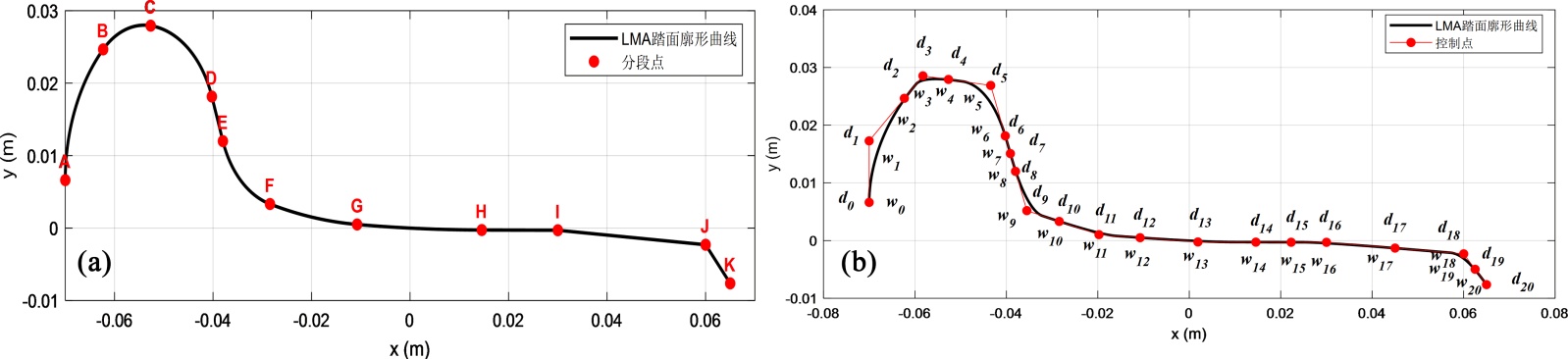 Figure 2. Parameterization of the LMA tread profile. (a) Schematic of the LMA tread profile; (b) NURBS-based parameterization of the LMA tread profile