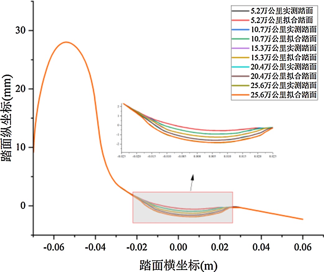 由图1可以看出,车轮踏面磨耗在踏面中部区域形成一处相对平滑的局部下凹,其典型特征为在名义滚动圆附近形成沿踏面横向分布的凹陷区域,其横向分布以滚动圆附近为中心,沿踏面横向坐标呈近似对称分布。随着运行里程的增加,凹型磨耗的最大磨耗深度逐渐增大,同时磨耗影响范围在横向方向上有所拓展,但磨耗形态整体保持稳定,其几何分布范围始终集中在踏面中部约−25~25 mm区域内。