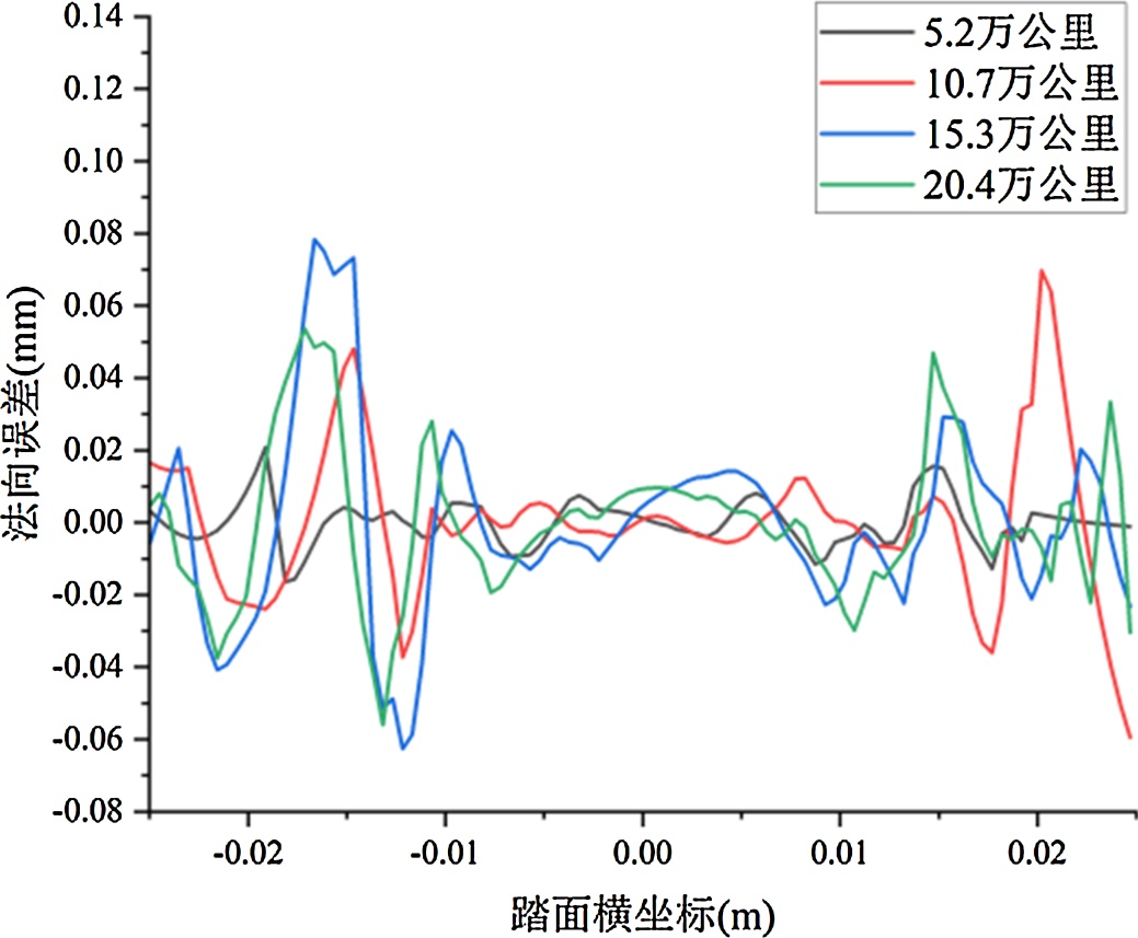 由图4可以看出,不同运行里程条件下参数化踏面的法向误差均小于0.08 mm,所建立的参数化模型在不同磨耗阶段均具有较为稳定的拟合精度,基于NURBS曲线的踏面凹型磨耗参数化建模方法能够在不同服役里程条件下表征凹型磨耗的几何特征。