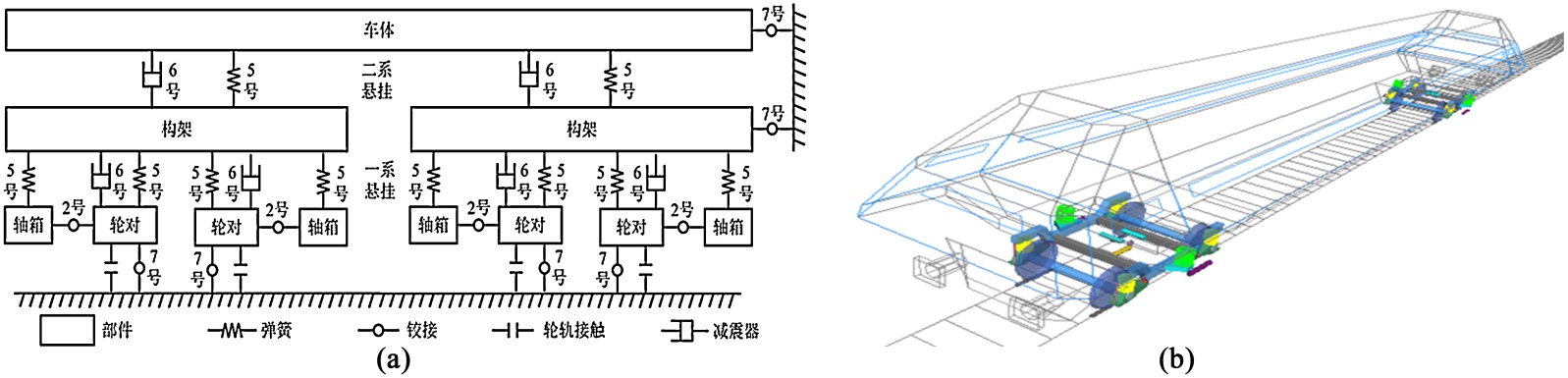 图5. 某型高速列车动力学模型。(a) 某型高速列车动力学模型拓扑图;(b) 某型高速列车动力学模型