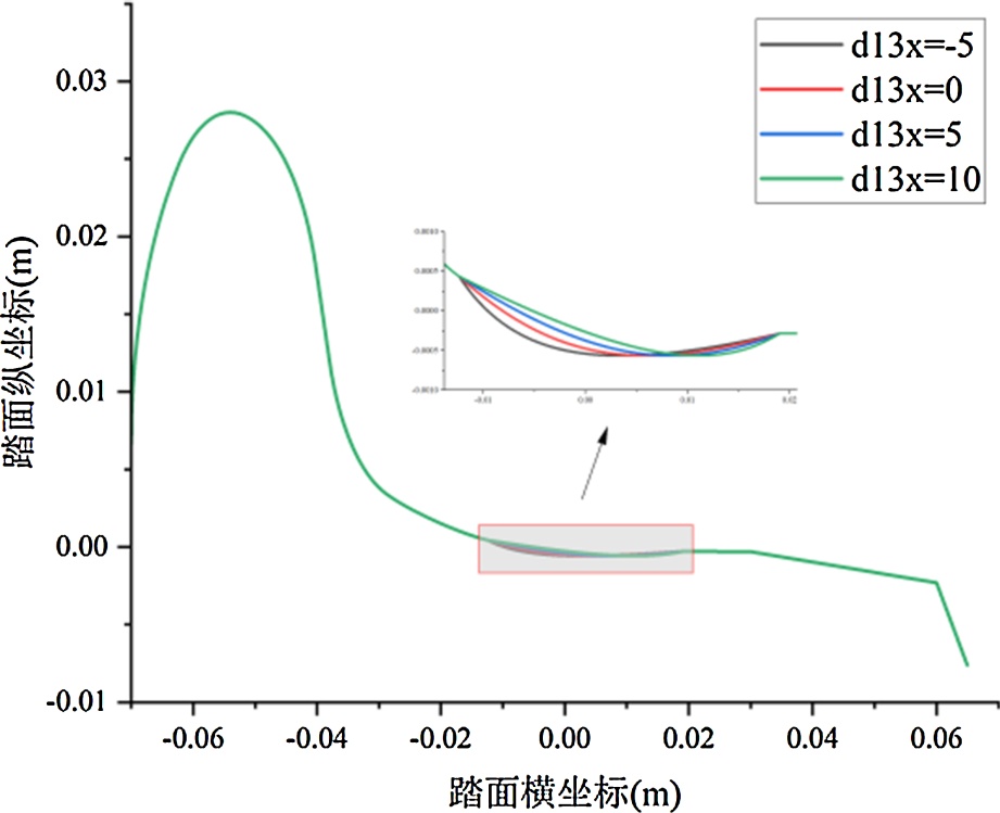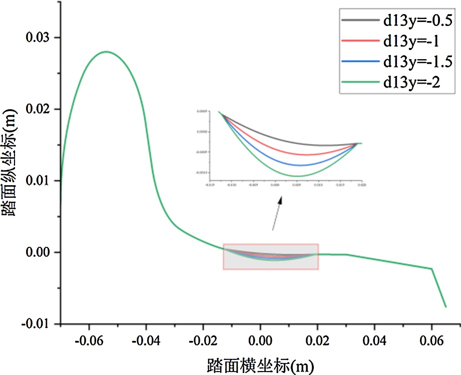 仅改变控制点d13的纵坐标,由图11可见,随着d13纵坐标绝对值的增大,凹型磨耗区域内的最大磨耗深度逐渐增加,而磨耗区域的横向分布范围变化较小。