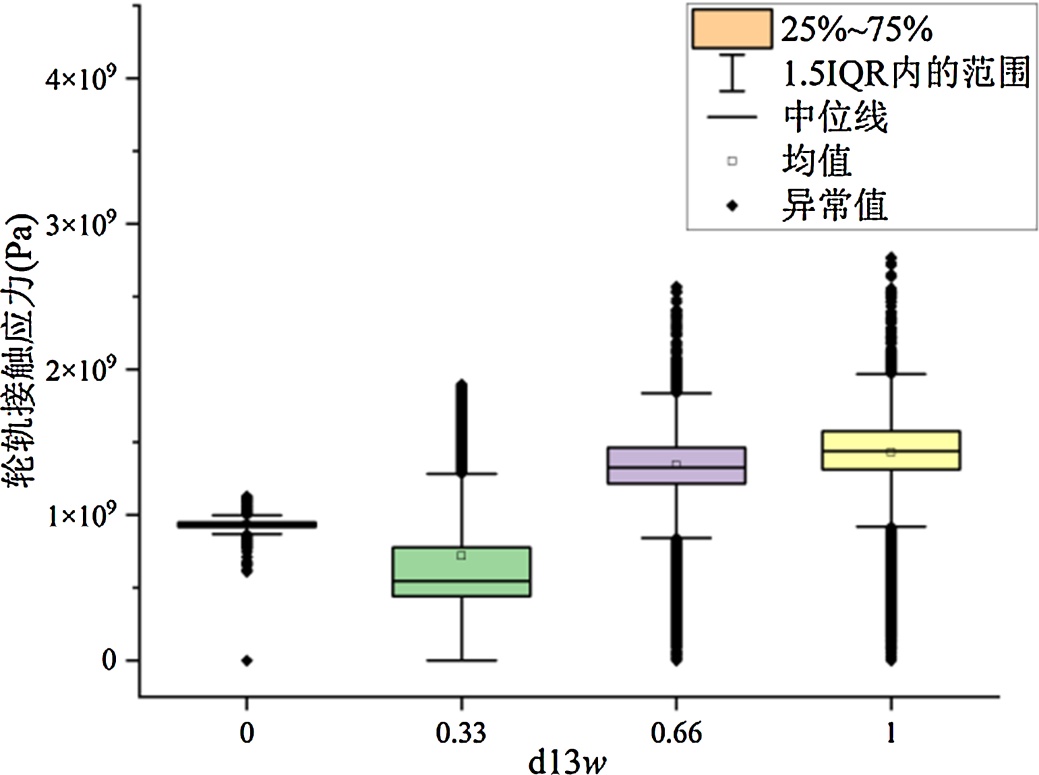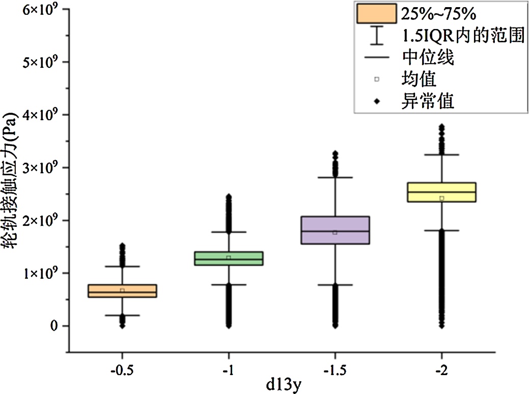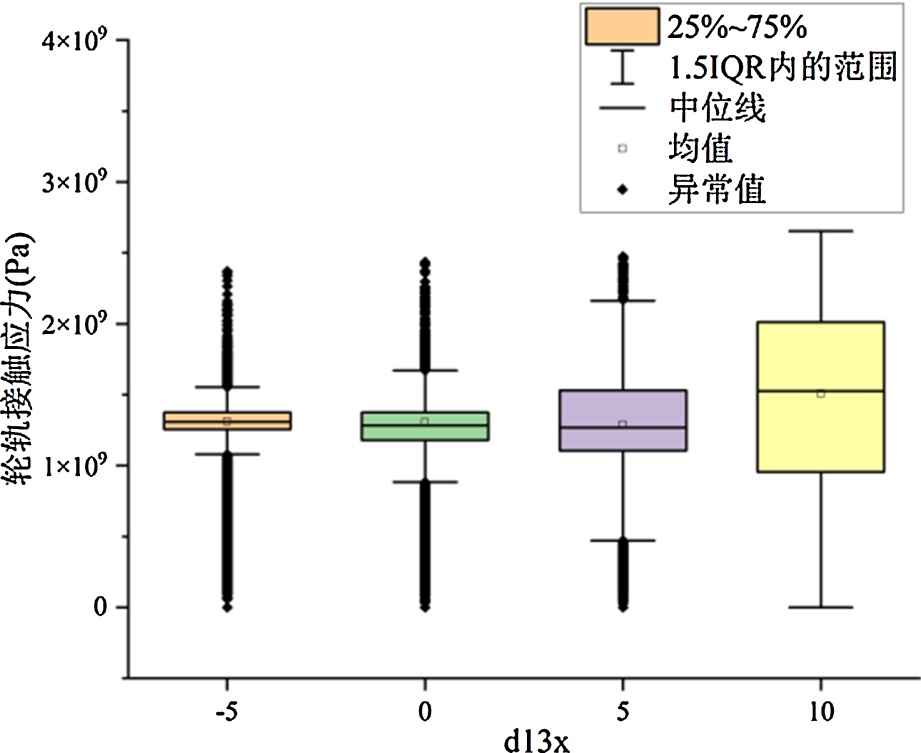由图7可以看出,随着d13x的增大,接触应力的中位数与均值均增大,说明凹型磨耗中心向踏面外侧偏移后,轮轨接触载荷的集中程度增强。