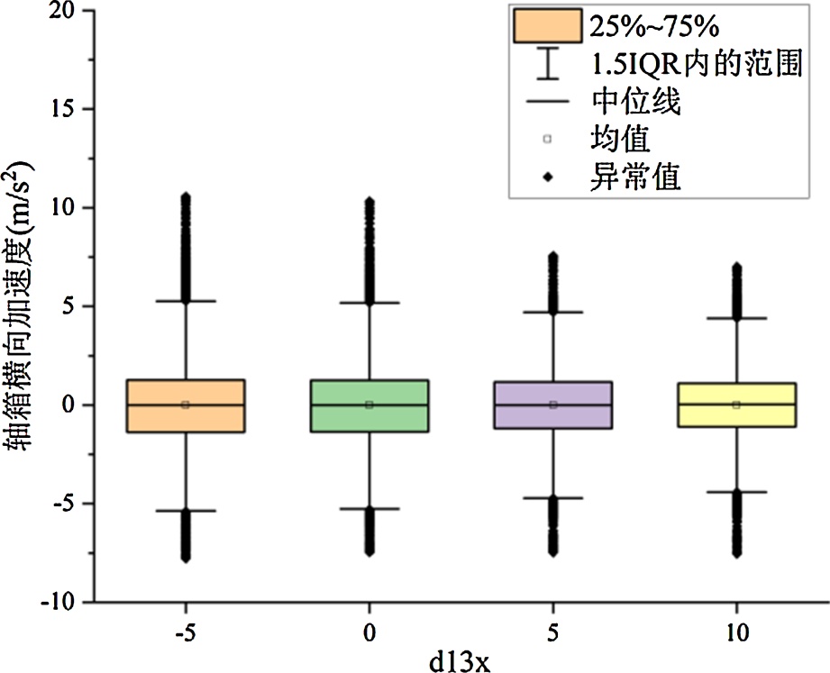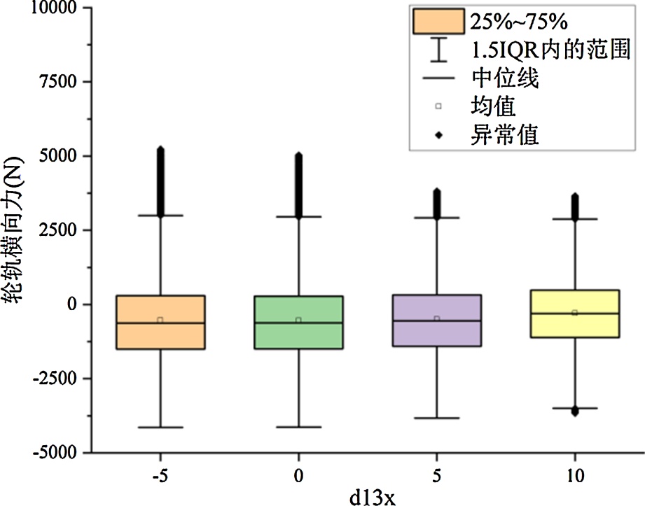如图8与图9所示,随着d13x由−5增大至10,轮轨横向力与轴箱横向加速度的中位数与均值整体上升;其中轮轨横向力在d13x = −5和d13x = 0时正向极大值较高。