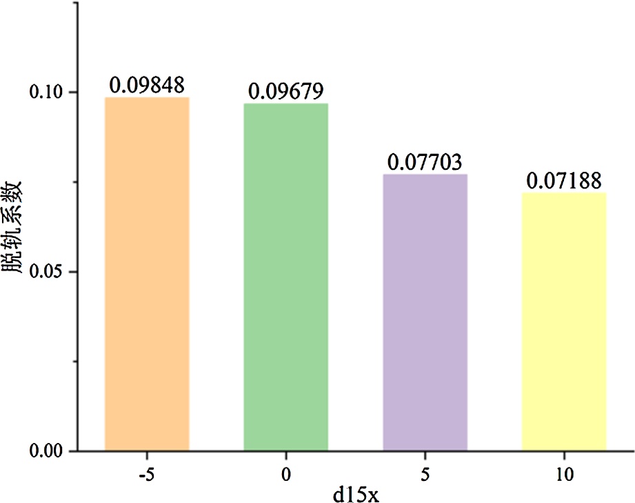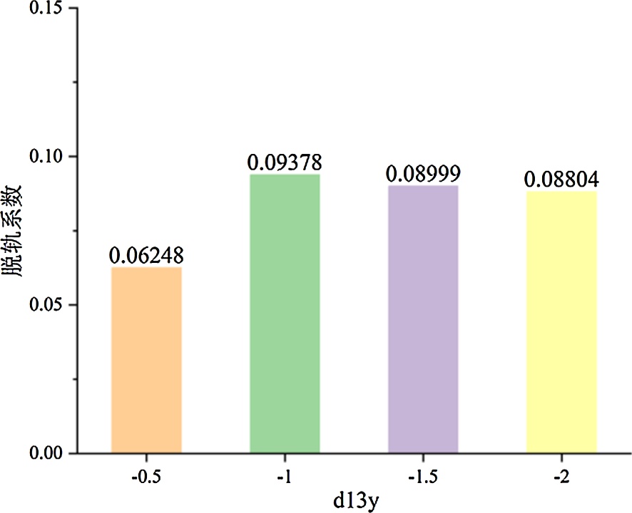 如图15所示,随着d13y由−0.5减小至−2 (绝对值增大),脱轨系数整体呈先增大后小幅回落的变化规律,由0.06248升至0.09378后降至0.08804;