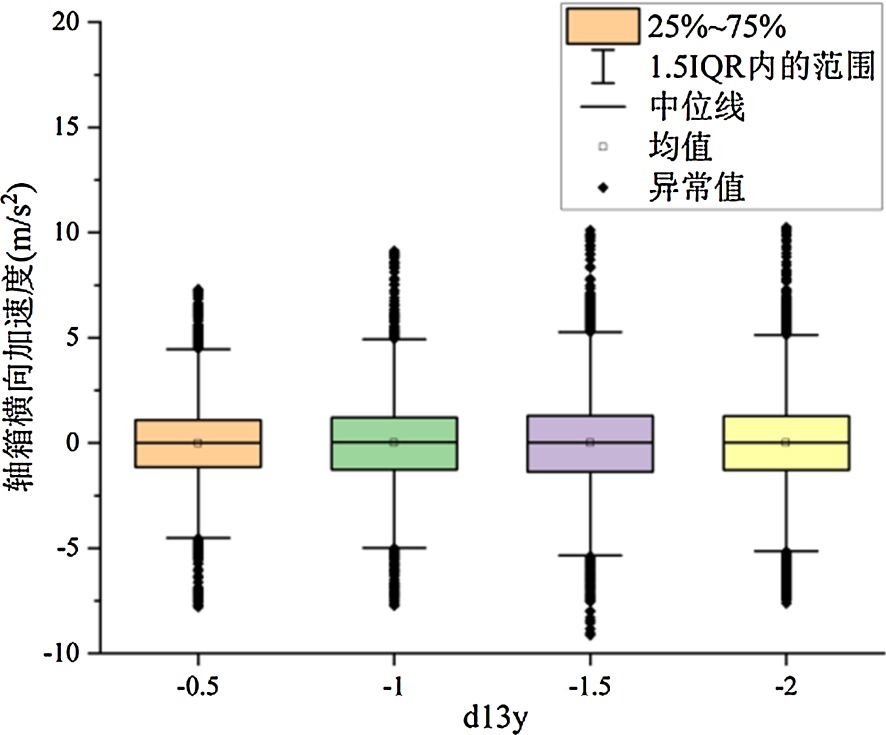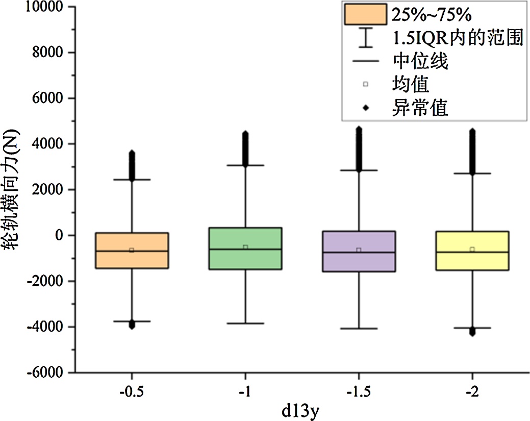 如图13与图14所示,随着d13y由−0.5变化至−2,轮轨横向力与轴箱横向加速度的中位数与均值仅呈轻微波动,说明响应中心水平总体较为稳定;其中轮轨横向力在d13y = −1.5与d13y = −2时负向极值略有加深,表明磨耗加深后仍可能诱发更不利的瞬时横向作用。