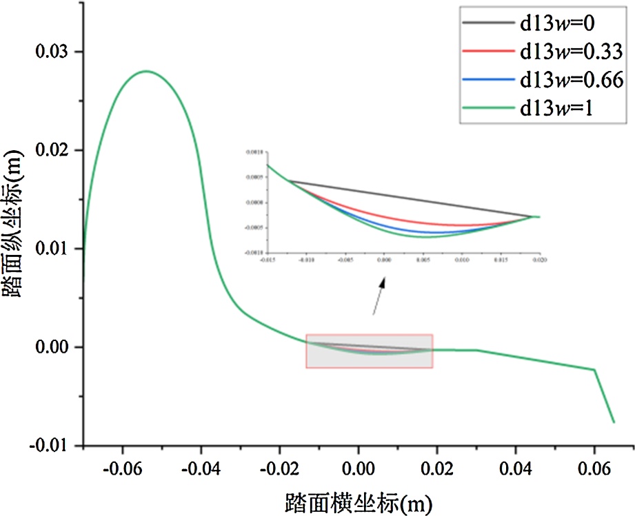 在保持凹型磨耗中心位置和磨耗深度不变的条件下,通过改变控制点d13的权因子,可对凹型磨耗区域内的局部几何形态进行调节。不同d13权因子取值条件下的踏面磨耗廓形如图16所示。