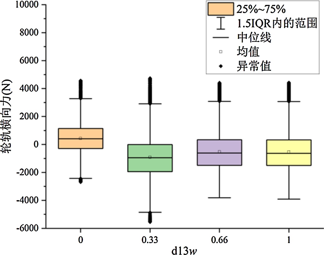 如图18与图19所示,不同d13w工况下轮轨横向力与轴箱横向加速度的统计分布存在一定差异,其中轴箱横向加速度整体差异较小。对于轮轨横向力而言,d13w = 0时其中位数与均值为正;当d13w增大至0.33后,中位数与均值转为负值且降幅最大,表明其中心水平发生明显变化;继续增大至0.66和1后,中位数与均值逐步向0靠拢,但整体仍偏负。与此同时,各工况主要波动区间变化有限,但d13w = 0.33工况出现更深的负向极值,说明该工况下瞬时横向作用相对更不利。