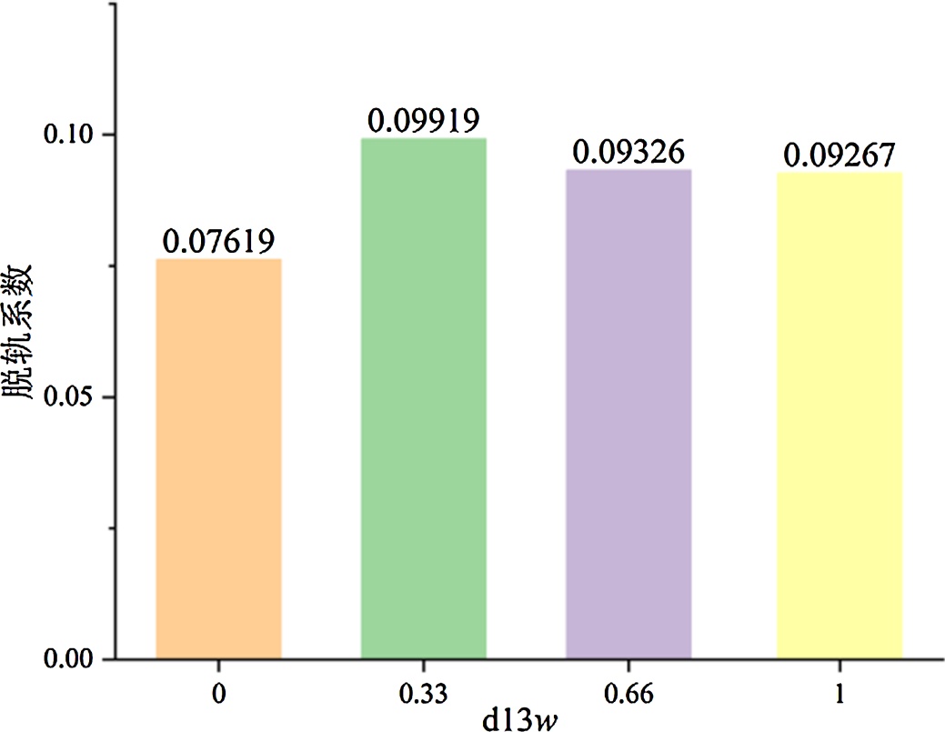 如图20所示,随着d13w由0增大至1,脱轨系数整体先增大后小幅下降,由0.07619升至0.09919后降至0.09267。其中,d13w = 0至0.33为主要变化区间,之后变化较小,表明d13w增大在一定范围内会提高脱轨系数水平,使安全性趋于不利。