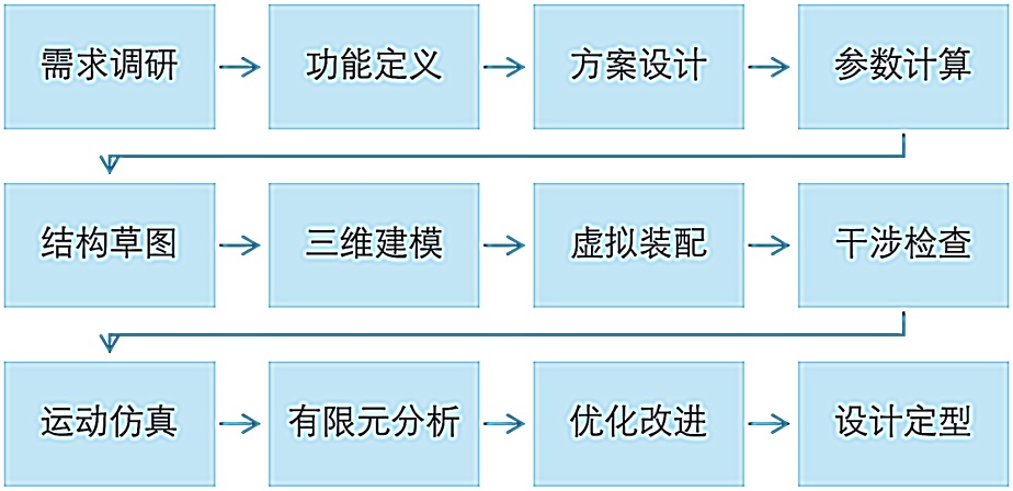 本研究过程按照逻辑顺序分为四个阶段:需求分析与方案设计、关键部件参数计算、三维建模与虚拟装配、仿真分析与优化。总体流程如图1所示。