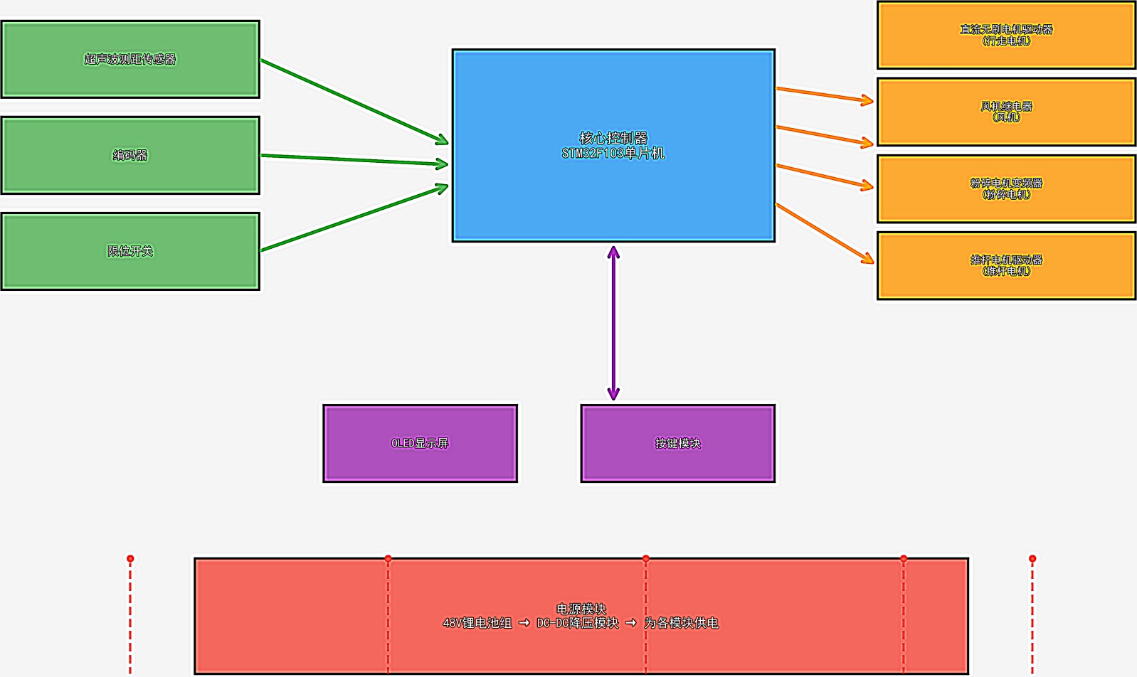 执行器包含直流无刷电机驱动器、风机继电器、粉碎电机变频器以及推杆电机驱动器。操作人员可通过OLED显示屏和按键模块设定工作参数,控制器则根据传感器反馈信号,经算法运算后向执行器发出指令,从而构成完整的反馈控制系统。