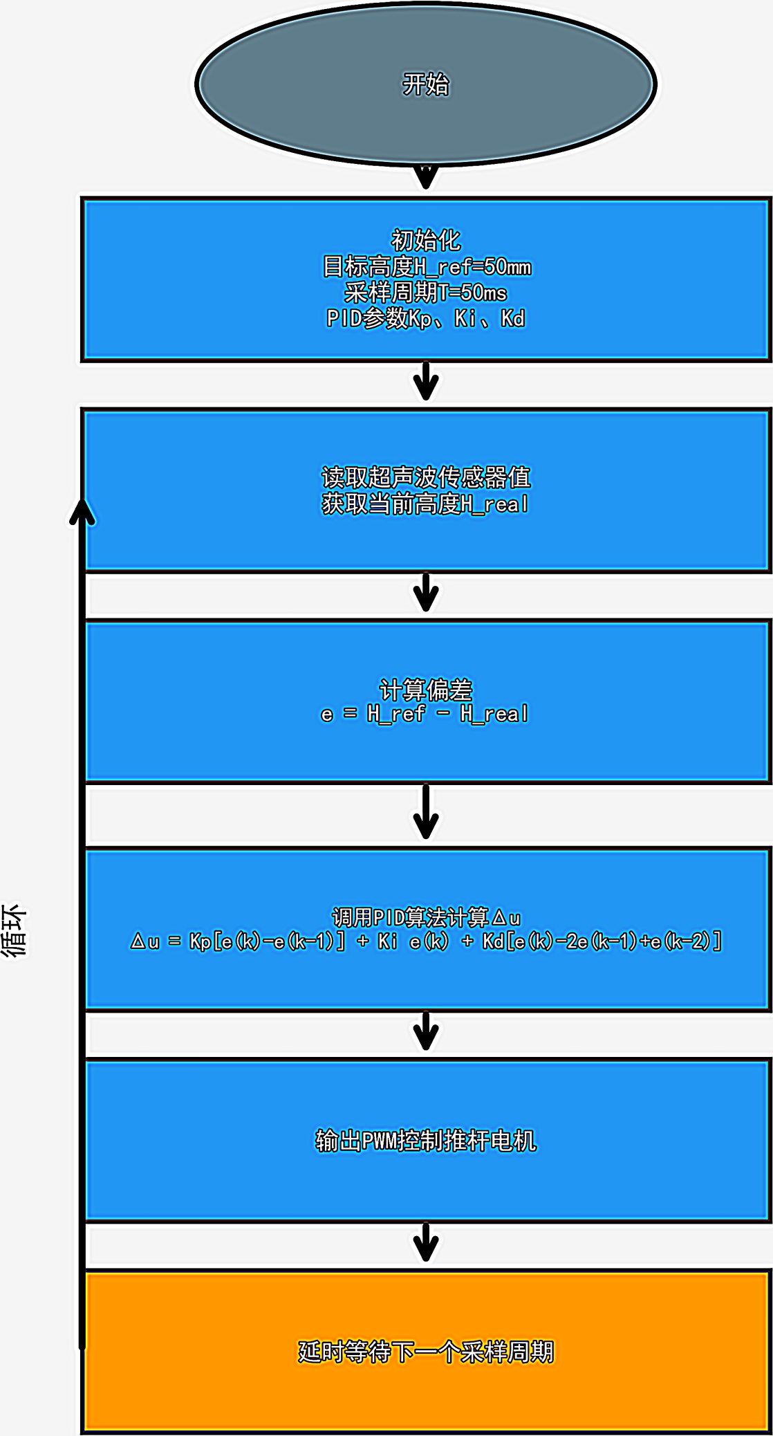 系统初始化后读取超声波传感器数值,计算当前高度偏差,调用PID算法得到控制量,输出PWM信号驱动推杆电机,从而实现吸盘高度的实时调整,程序循环执行上述步骤。
