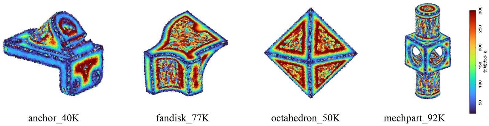 1) 在包含棱边、角点等尖锐特征的区域,大尺度邻域会跨越多个曲面,导致局部平面拟合出现偏差并造成特征平滑,因此这类区域需要较小的邻域。
