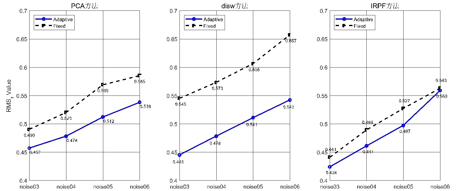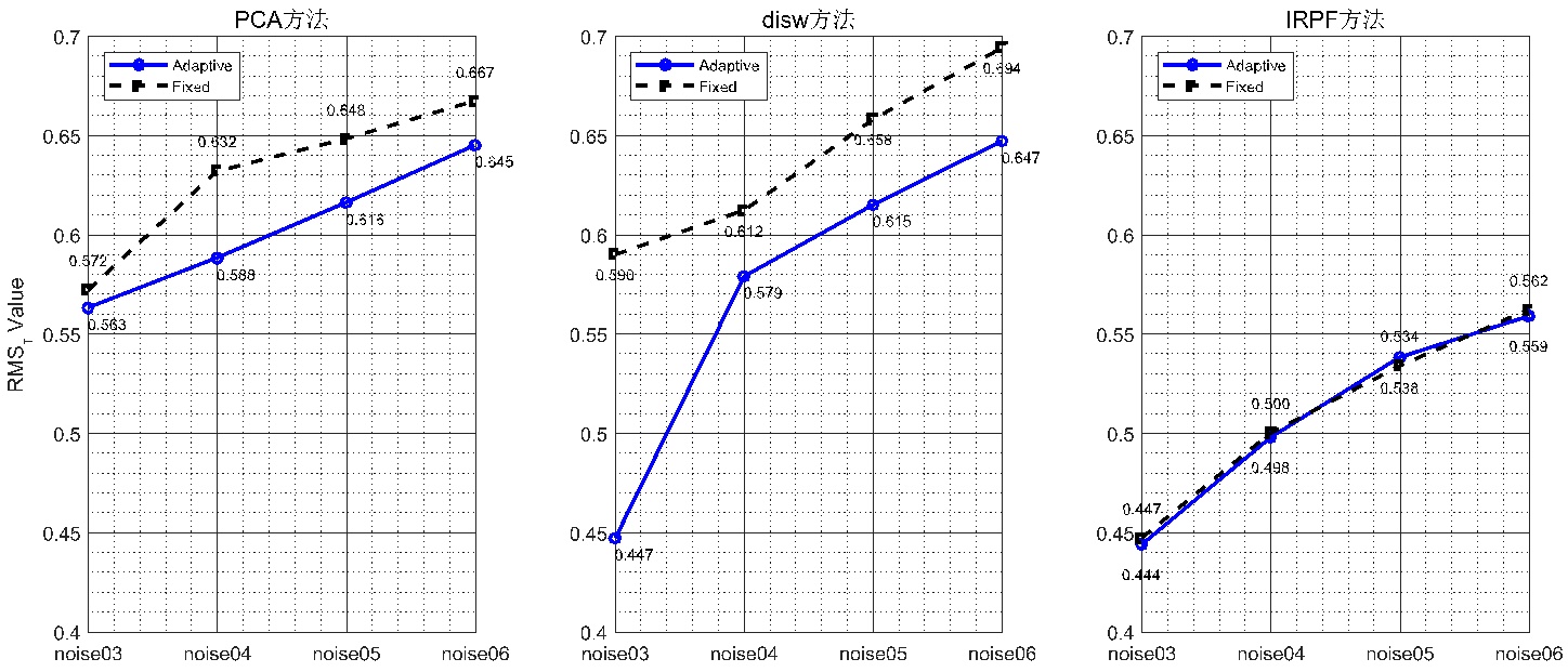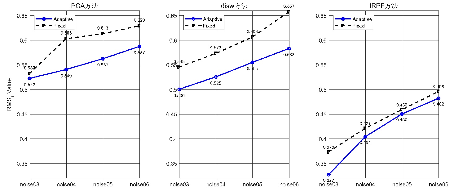 图5. 多模型应用PCA、disw、IRPF方法在固定最优尺度与自适应邻域尺度下的RMS角度误差对比折线图