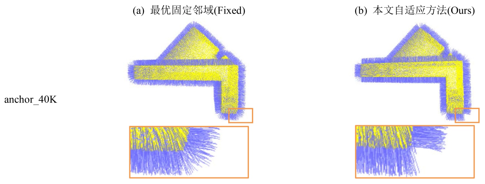 注:本定性对比基于IRPF方法在噪声点云(noise04)下的结果;左侧为最优固定邻域方法(Fixed),右侧为本文自适应邻域方法(Ours);橙色框为局部细节放大区域,用于直观展示特征保持能力的差异。