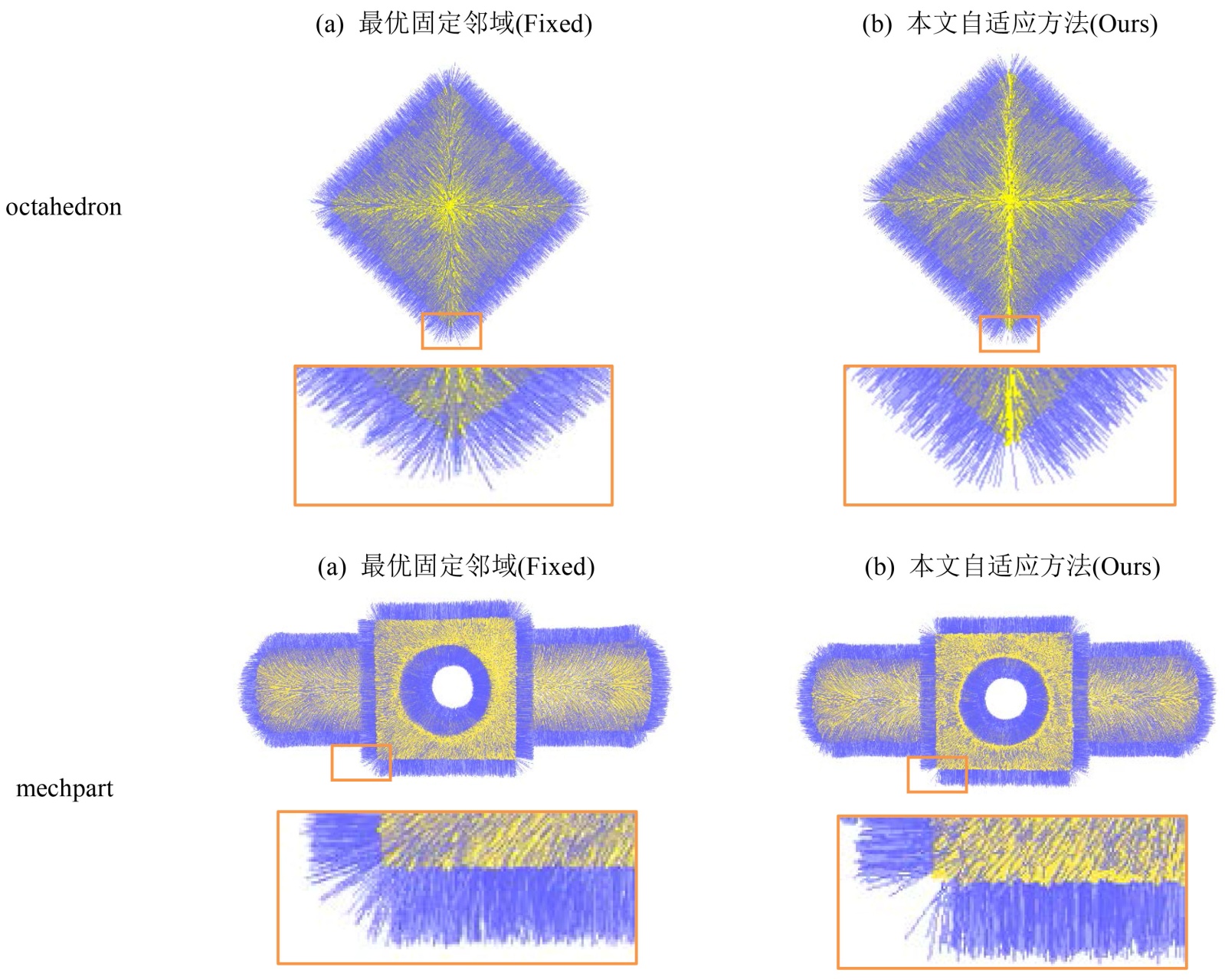 从图6的可视化结果可见:在anchor_40K模型的拐角尖锐特征区以及mechpart模型的孔洞边缘区域(橙色框),固定邻域方法(Fixed)法向分布紊乱,尖锐特征边界模糊;而本文自适应邻域方法(Ours)法向一致性显著提升,可精准保留尖锐特征。在octahedron模型的顶点细节处,固定邻域方法估计的法向发散,而本文自适应邻域方法估计的法向聚集性更佳,对顶点精细几何特征的捕捉能力更强。综上可见,本文自适应邻域方法在特征保持与噪声鲁棒性方面,显著优于固定尺度邻域方法。