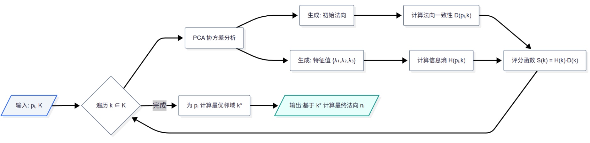 。以此为不同局部几何特征的点匹配最合适的邻域尺度,从而实现更鲁棒和精确的法向量估计。图2展示了该方法的具体执行流程: