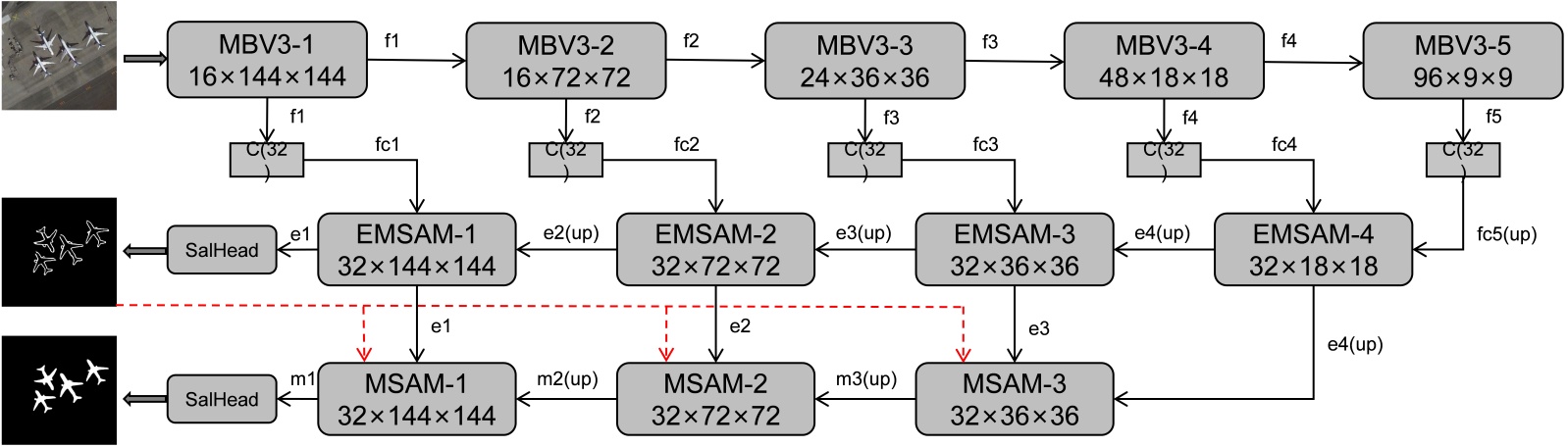 鉴于光学遥感图像显著目标检测具有重要的理论意义和实际应用价值,相关模型研究不断推进,涌现出多种代表性方法:Liu等人[10]提出US-CMC模型,基于颜色马尔可夫链与圆形特征相关性理论实现对油库的无监督显著检测。Li等人[11]提出LVNet模型,设计L型双流金字塔模块与V型嵌套编码–解码结构,通过双流金字塔提取多尺度互补特征以感知目标局部细节,借助嵌套连接融合编解码特征,实现复杂背景高效抑制。Zhang等人[12]提出DAFNet,引入含全局特征聚合单元与级联金字塔注意力单元的GCA模块,前者增强空间位置特征嵌入关联性,后者将注意力图从粗到精优化,可捕获长距离语义关联、适配遥感目标尺度变化,并引导高维特征注意力图生成。Zhou等人[13]提出ERPNet,采用编码器–双并行解码器结构,边缘提取模块与编码器构成U型结构以提供精准边缘线索并保障信息完整,特征融合模块通过EPAU将边缘信息融入解码,锐化目标定位并校准特征学习方向。Li等人[14]提出CorrNet,针对光学遥感图像特性进行轻量化优化,对VGG-16主干网络轻量化处理后,通过特征相关性模块(CorrM)挖掘高层语义特征中的目标位置信息,以“粗到精”策略生成显著图,最终模型仅含4.09 M参数量,实现了检测精度与效率的良好平衡。Luo等人[15]提出SAFINet,该网络以MobileNet V2为骨干,融合多尺度注意力融合、注意力反馈特征细化及空间相关模块,通过递归的高分辨率空间注意力反馈实现高低分辨率特征的精准融合,最终模型仅含3.12 M参数量,同样实现了检测精度与效率的良好平衡。