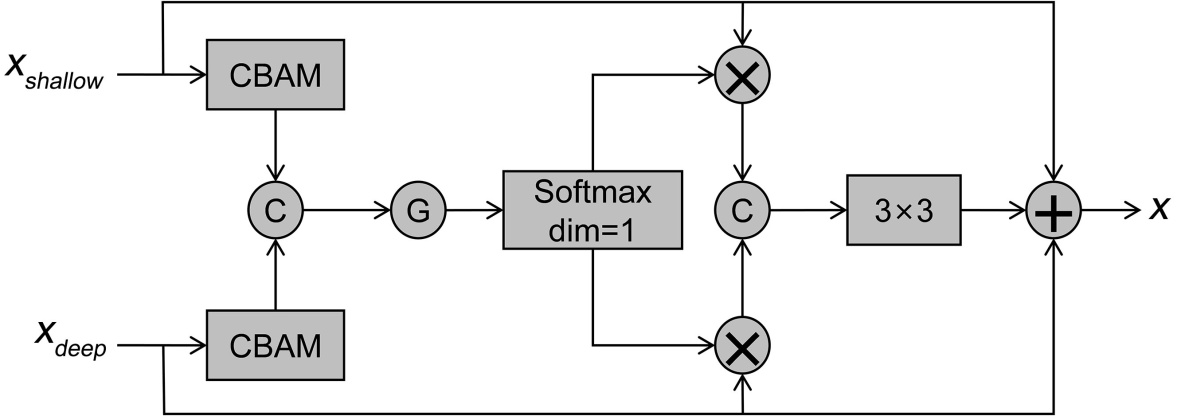 CLC (Cross-Layer Correlation,跨层相关性)具体结构见图3,CBAM [18]是经典的轻量级注意力模块,这里用来处理浅层和深层特征,再将处理过的特征图拼接在一起,通过一个卷积后利用函数Softmax生成权重图,再分配对应通道数的权重特征图与初始输入的特征图相乘,后续再经过并联、卷积和相加即可得到上面提到的跨层相关特征图。