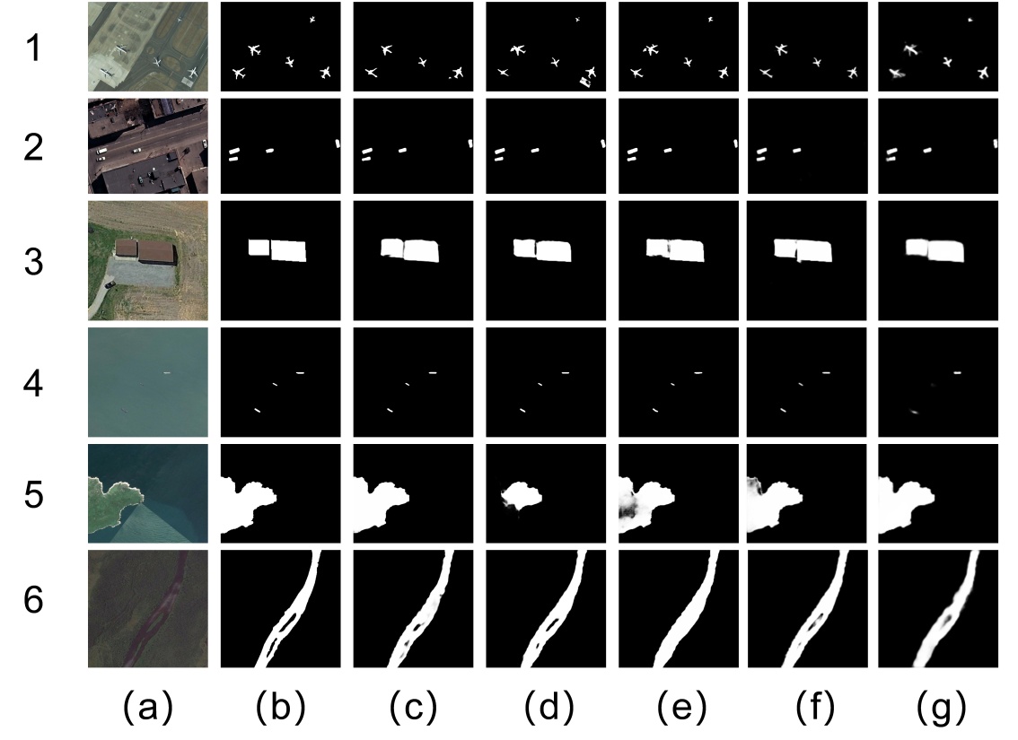 图6. 不同模型显著目标预测图的对比。(a) 光学遥感图像;(b) 真实标签;(c) EGLANet;(d) SAFINet;(e) CorrNet;(f) ERPNet-R;(g) DAFNet-R