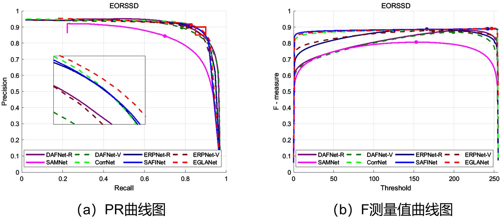 由图7可知,EGLANet的PR曲线虽与其他对比模型的曲线相互重叠,但放大曲线右上角区域可见,EGLANet还是比其它方法更靠近右上角。对于F测量值曲线,CorrNet、SAFINet和EGLANet三条曲线重叠在一起,覆盖面积相近并且大于其它方法。总的来说,EGLANet还是优于其它方法。