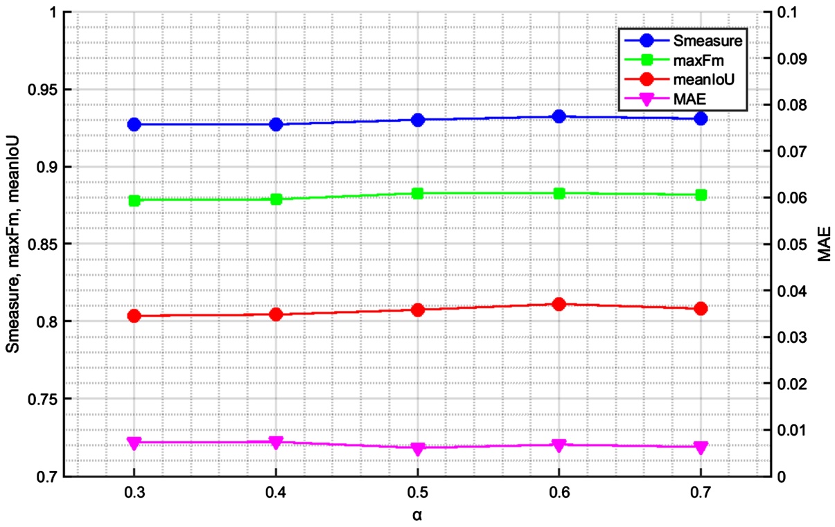 进行线性搜索实验,但进行穷尽搜索的时间成本过高,所以我们只补充取值为0.3、0.4、0.6和0.7的四组实验,然后通过四项评价指标展示模型性能的变化趋势(见图8)。图中Smeasure、maxFm和meanIoU曲线对应左侧y轴,MAE曲线对应右侧y轴。由图可知,四项指标的曲线变化相对平稳,这表明所提模型对超参数的敏感性较低,进而证得
