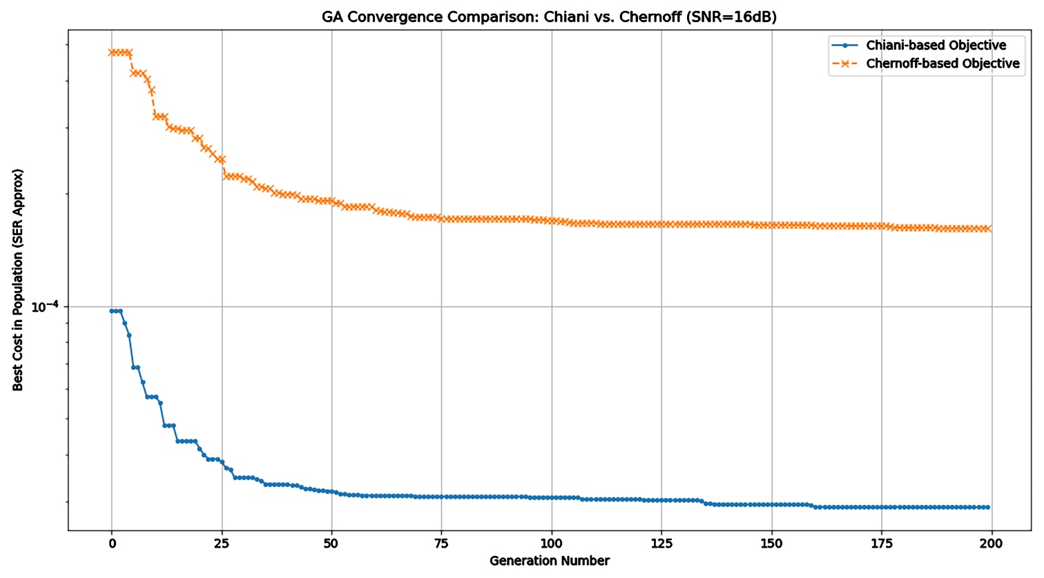 相比之下,本文方法的优势在于:不是从启发式几何规则或单一距离准则出发,而是直接基于下行瑞利衰落信道中的SER近似表达式建立优化目标函数,使星座参数优化与实际误码性能更紧密对应。特别地,已有研究多采用Chernoff界来近似PEP,但Chernoff界相对较松,导致构造的目标函数与真实误码性能之间存在偏差。为此,本文摒弃较宽松的Chernoff界,创新性地采用更精确的Chiani界来构建SER目标函数,并在此基础上结合球面打包初始化与GA-SQP混合优化求解,从而得到性能更优的母星座。
