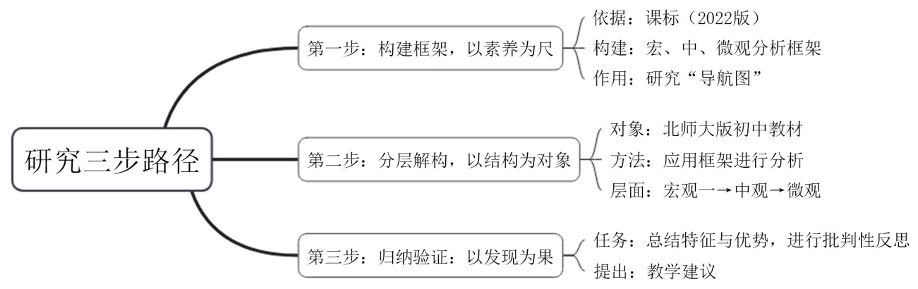 基于第二步的实证分析,归纳总结北师大版教材在编排结构上落实核心素养的核心特征、突出优势与内在逻辑。同时,进行批判性讨论,反思其可能存在的挑战,如探究深度与课时容量的矛盾,并最终从教材编写与教师理解使用两个角度,提出具有建设性的启示与建议。见图1。
