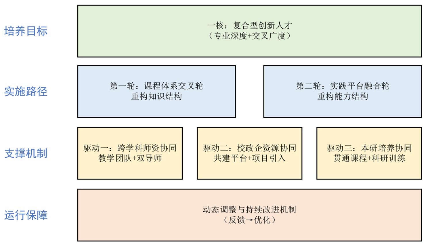 以交叉融合为路径:从知识叠加走向深度融合,在课程、实践、师资、平台等多个层面实现跨学科的实质性交叉,形成“1 + 1 > 2”的协同效应。