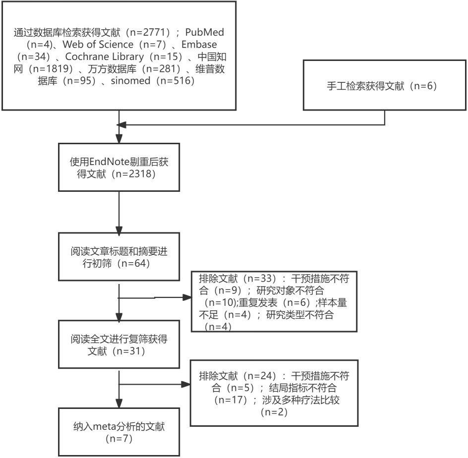 本研究通过检索8大数据库共获得相关文献2771篇,另从已纳入研究的参考文献列表中手工检索补充文献6篇。经Endnote软件剔除重复文献后,剩余文献2318篇。通过阅读标题与摘要进行初步筛选,得到64篇潜在相关文献。进一步阅读全文,并依据预设的纳入与排除标准进行复筛,最终确定7篇文献纳入分析。具体文献筛选流程见图1。