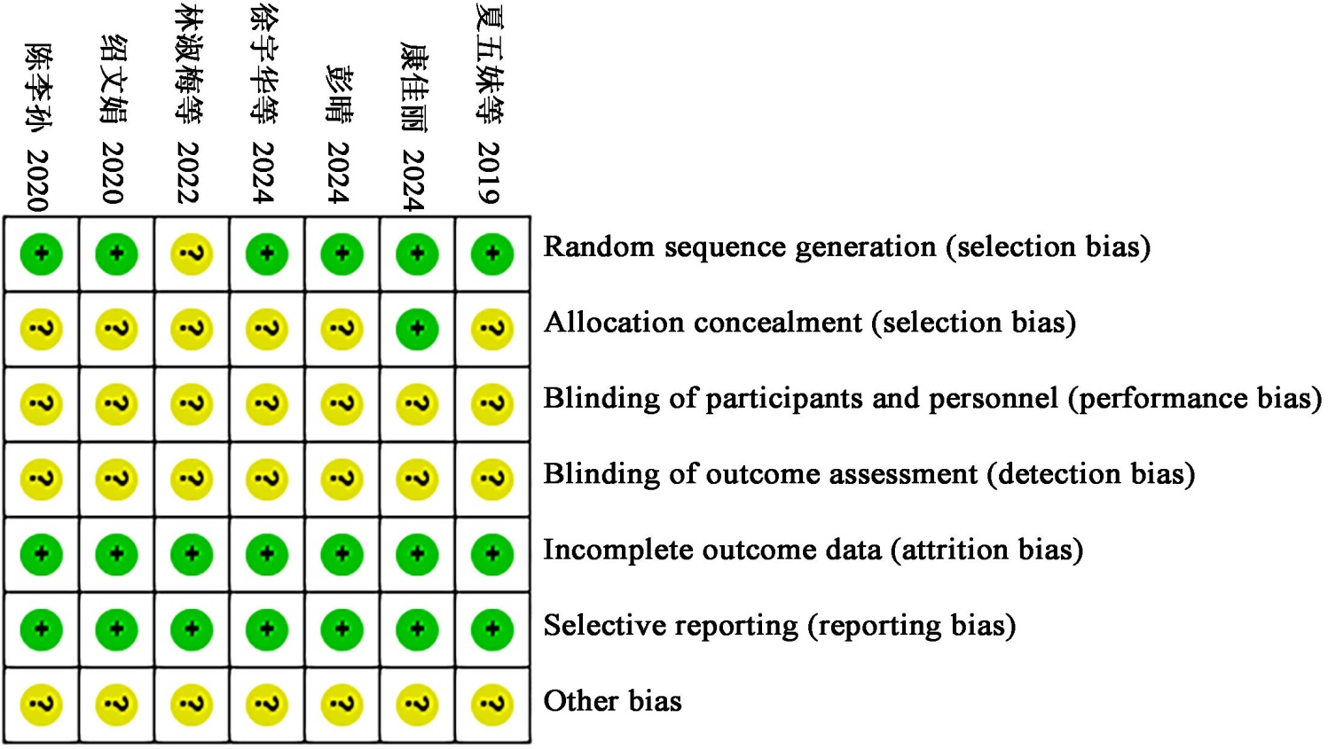 纳入文献采用Cochrane偏倚风险评估工具进行质量评价,评估共涉及以下七个维度:随机序列的产生、分配方案的隐藏、对研究者与受试者实施盲法、对结局评估者实施盲法、结局数据的完整性、选择性报告结局,其他可能的偏倚来源。文献质量通过三个风险等级进行评定:低风险(满足所有标准)、高风险(不满足标准)和不明确(信息不足以判断)。对于质量评估存在争议的文献,与第三名研究者进行协商确认。