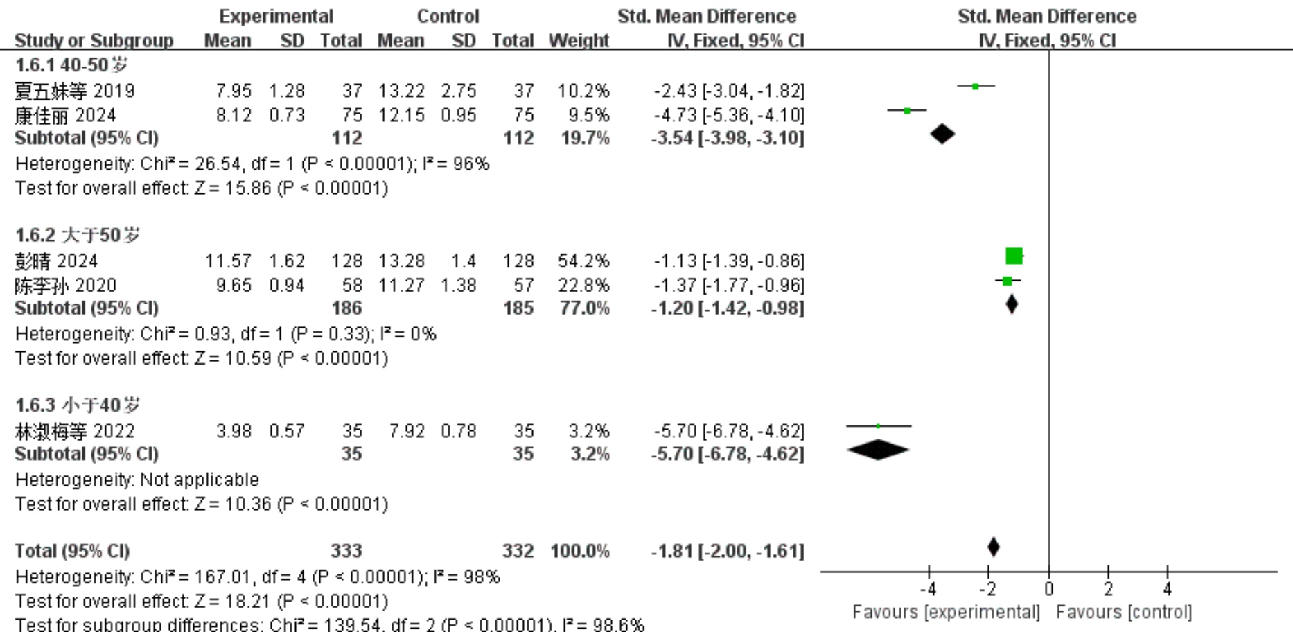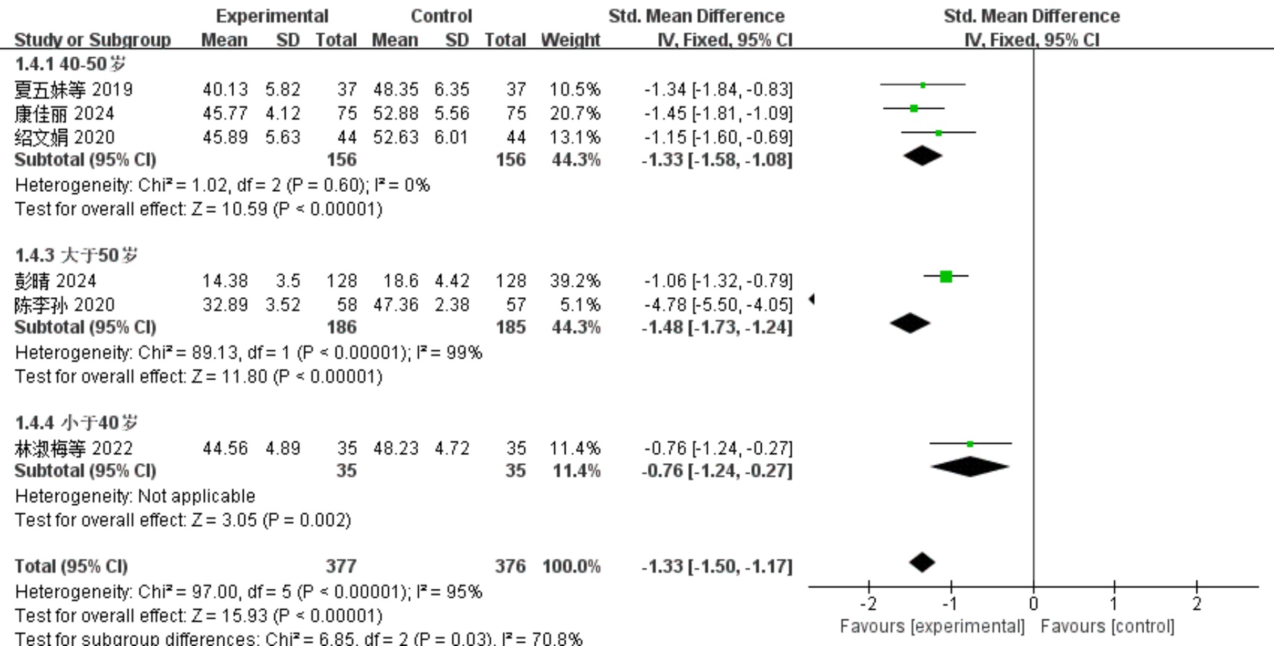 本研究共纳入6篇文献[7]-[12]评估针灸对TC术后焦虑的疗效,其中5篇[7]-[10] [12]采用焦虑自评量表(SAS),1篇[11]采用汉密尔顿焦虑量表(HAMA)。使用标准化均数差(SMD)为效应指标,异质性检验认为各项研究间异质性显著(I2 = 95%, P < 0.00001),遂选择随机效应模型进行分析。结果表明,针灸干预组术后焦虑评分低于对照组(SMD = −1.33, 95% CI = [−1.5, −1.17], P < 0.00001)。将患者按照整体平均年龄分为三个组别,分别为年轻组(平均年龄 < 40岁)、中年组(40岁 < 平均年龄 < 50岁)、老年组(平均年龄 > 50岁)。该分组设计基于以下证据:首先,TC的生物学行为具有显著年龄相关性:年轻患者(<40岁)虽预后较好,但更易出现BRAF-V600E等基因突变[14];40~50岁群体因激素波动与社会角色压力,术后心理障碍发生率升高[15];而老年组患者则被AJCC第8版分期系统界定为高风险人群,其10年生存率较年轻组下降15%~20% [16]。其次,生理转折点证据显示:40岁为慢性病累积起始年龄,50岁接近女性更年期及男性雄激素下降拐点[17],所以本研究特别保留40~50岁独立分组,这也能反映“中年危机”对疾病转归的潜在影响。据此对6篇文章进行亚组分析(其中年轻组1篇[12]、中年组3篇[7]-[9]、老年组2篇[10] [11]),结果显示:中年组疗效稳定,无异质性(I2 = 0%, P < 0.00001);老年组疗效不稳定,异质性极高(I2 = 99%, P < 0.00001);年轻组疗效较弱(P = 0.002) (见图3)。