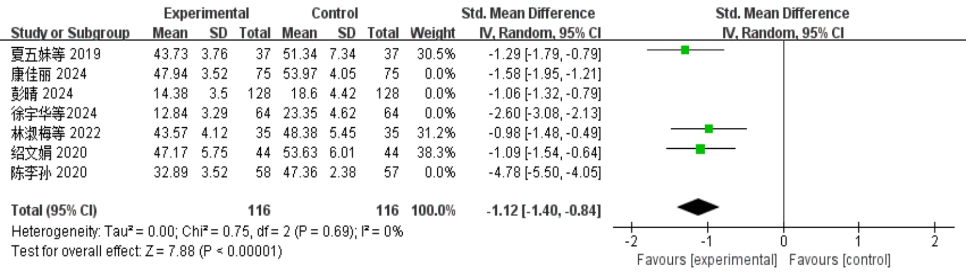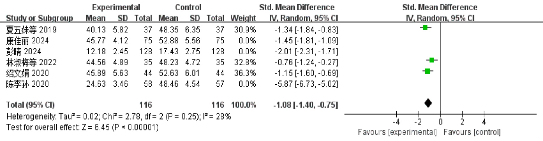 P < 0.00001)、抑郁状态评分(SMD = −1.99, 95% CI = [−2.80, −1.18],